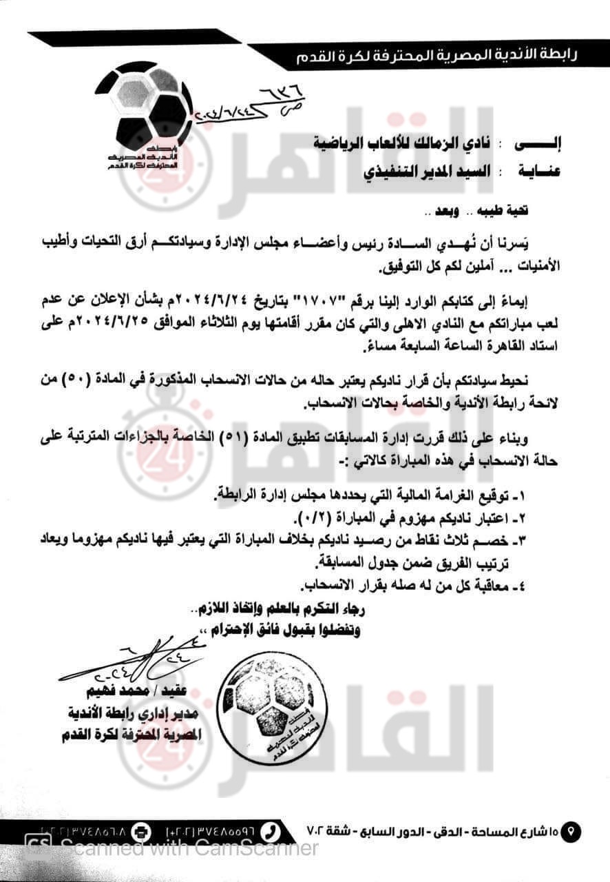 وتضمن خطاب رابطة الأندية الموجه إلى نادي الزمالك 4 عقوبات تقرر توقيعها على الفريق الأبيض، بعد الانسحاب من مباراة الأهلي.