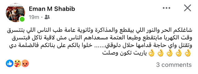 وقالت إيمان شبيب عبر صفحتها: شاغلكم الحر والنور اللي بيقطع والمذاكرة وثانوية عامة، طب الناس اللي بتتسرق وقت الكهربا مابتقطع وطبعا العتمة مسعداهم الناس مش لاقية تاكل فبتسرق وتقتل واي حاجة قدامها حلال دلوقتي، خلوا بالكم على بناتكم في الضلمة ياريت تكون وصلت.