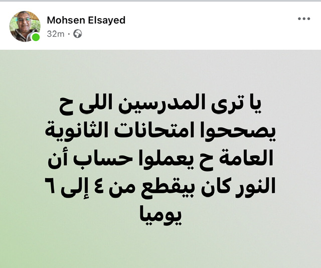 وتسائل محسن السيد عبر صفحتة: يا ترى المدرسين اللى هيصححوا امتحانات الثانوية العامة هيعملوا حساب أن النور كان بيقطع من 4 إلى 6 يوميا.