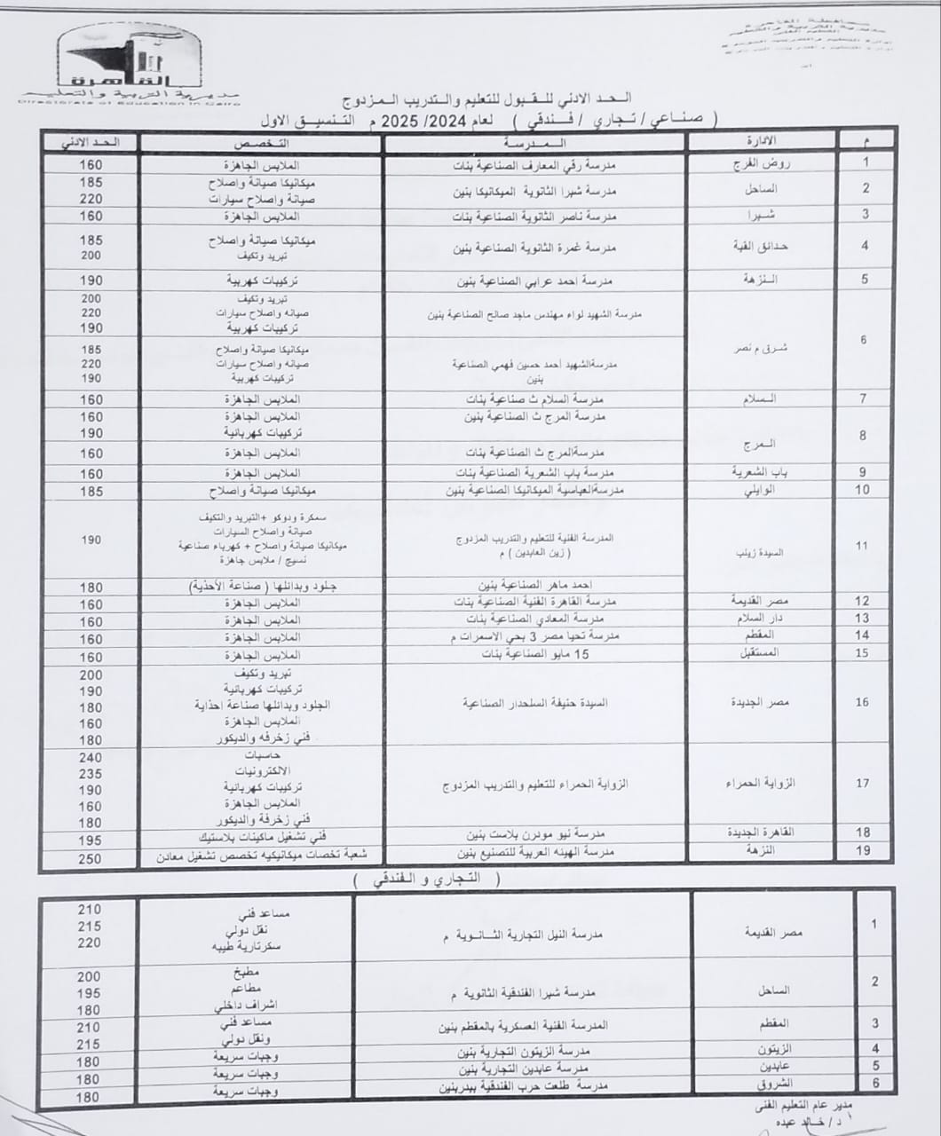 حيث تم تخصيص حوالي 8 مدارس، أما مدارس صناعية بنين بنظام الـ 3 سنوات فكان بحد أدنى 180 درجة، وهناك مدارس صناعية بنات بنظام 3 سنوات بحد أدنى 180 درجة، أما إعدادية مهنية من مجموع 120 درجة.. وإليكم تصنيف المدارس.