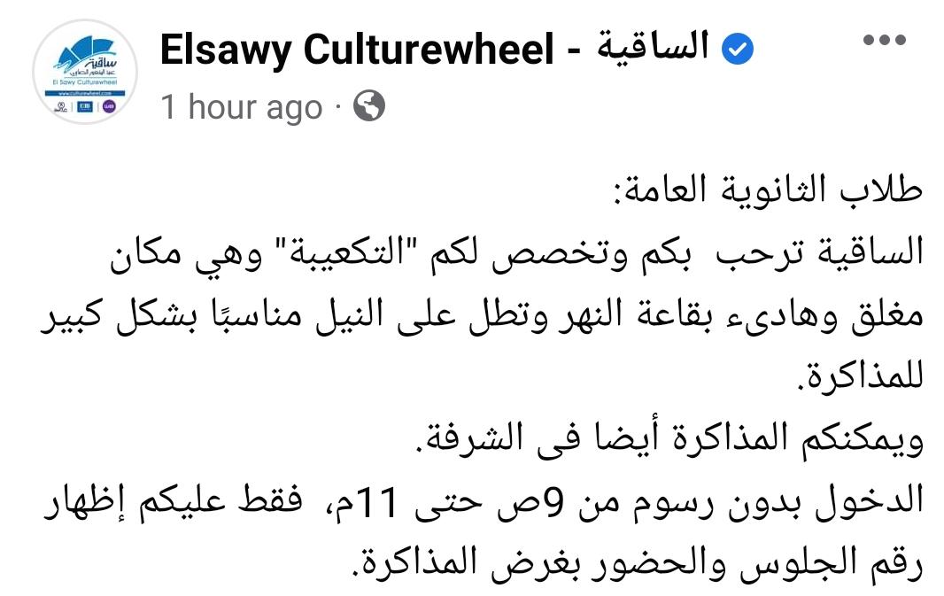 ومن خلال رقم الجلوس، خصصت ساقية الصاوي التكعيبة كمساحة هادئة ومغلقة لطلبة الثانوية العامة بقاعة النهر المطلة على النيل بشكل مناسب للمذاكرة، بقولها: القاعة مفتوحة لطلبة الثانوية العامة من الساعة 9 صباحا وحتى الساعة 11 مساءً دون رسوم دخول، شريطة إظهار رقم الجلوس عند الحضور، فضلا عن إمكانية المذاكرة في الشرفة.