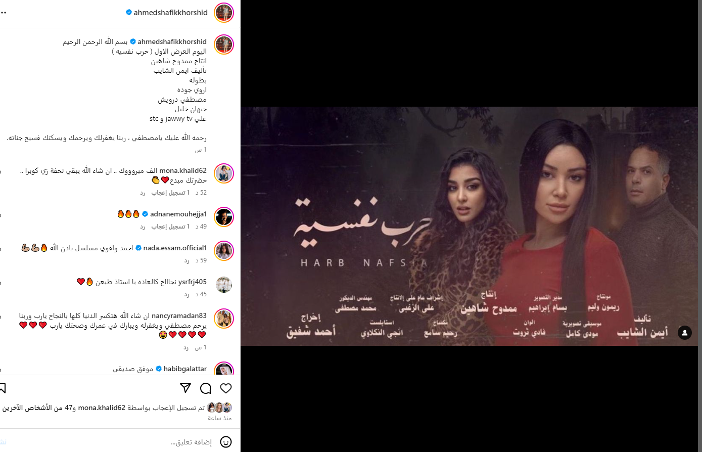 ونشر المخرج أحمد شفيق عبر حسابه الشخصي على موقع تبادل الصور والفيديوهات إنستجرام، البوستر الرسمي لـ مسلسل حرب نفسية، وعلق عليها: بسم الله الرحمن الرحيم، اليوم العرض الأول حرب نفسية، إنتاج ممدوح شاهين، تأليف أيمن الشايب، بطولة أروى جودة، مصطفى درويش، چيهان خليل.