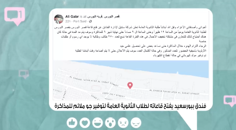 وأردفت: كما أن مكتبة الإسكندرية قررت فتح أبوابها مجانًا يوميًا من الساعة 7 ونص إلى الساعة 10 ونصف مساءً لكل طلاب الثانوية العامة والدخول فقط برقم الجلوس، بالإضافة إلى فتح أبواب المساجد والكنائس من أجل الاستفادة من المولدات الموجودة في أدوار العبادة.