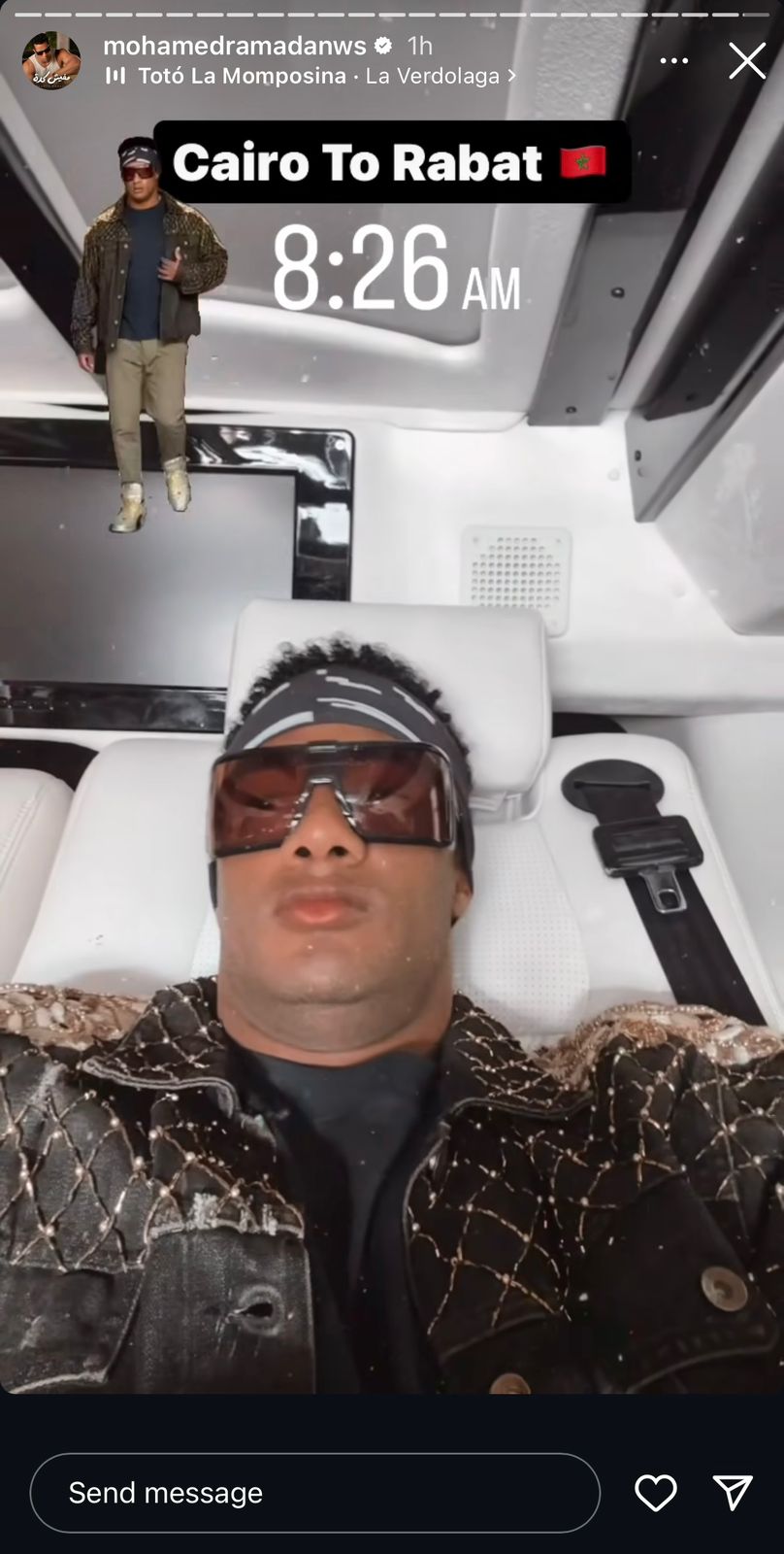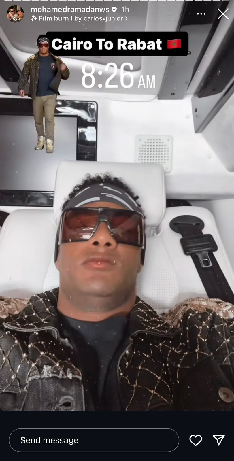 ونشر محمد رمضان، مقطع فيديو له داخل سيارته الخاصة، عبر خاصية ستوري على حسابه الشخصي بموقع تبادل الصور والفيديوهات إنستجرام، وعلق قائلًا: مسافر إلى الرباط ثقة في الله نجاح.