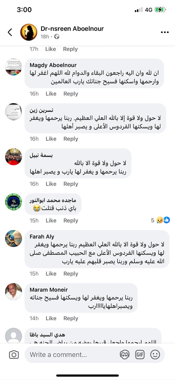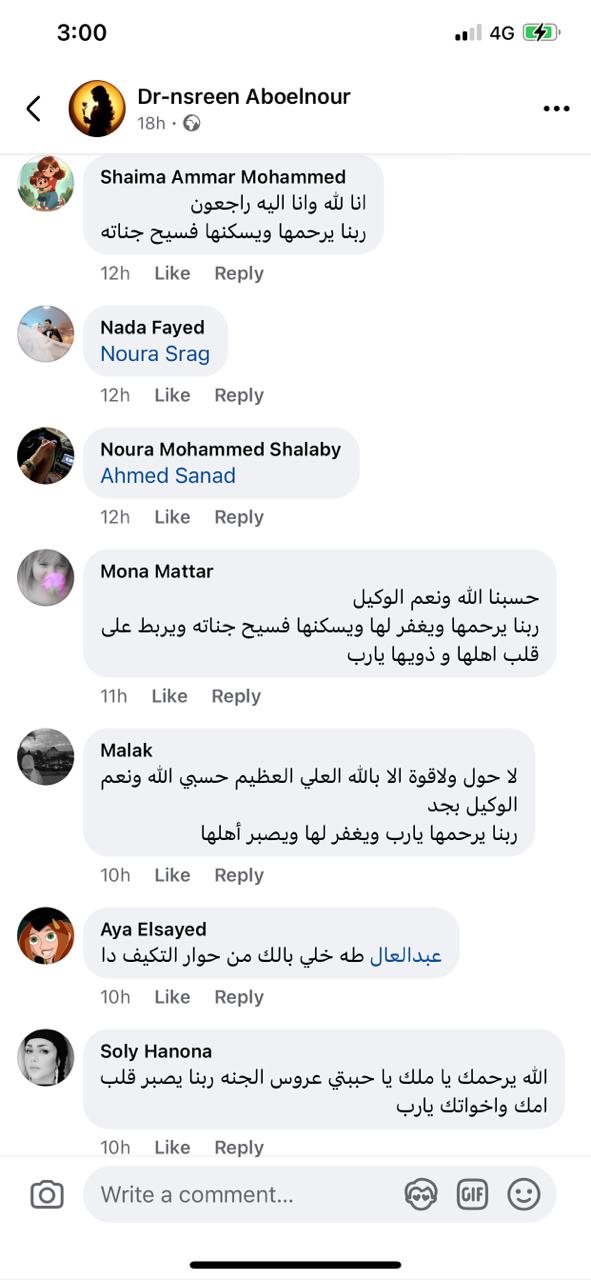 ونعى عدد من المقربين وأهالي المحافظة الطالبة، وكتبوا: إنا الله وإنا إليه راجعون.. ربنا يرحمها ويغفر لها ويسكنها فسيح جناته.
