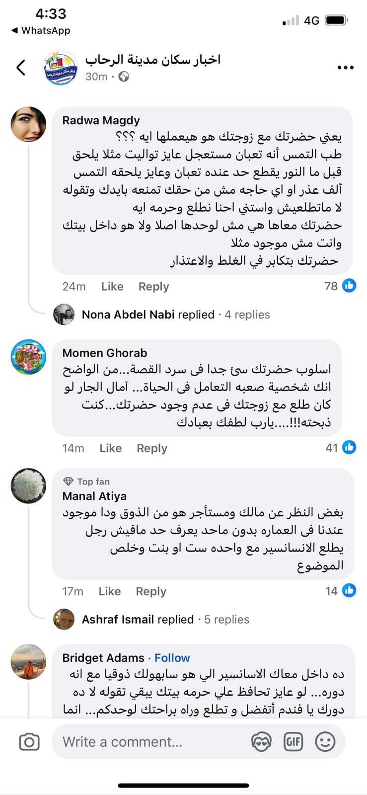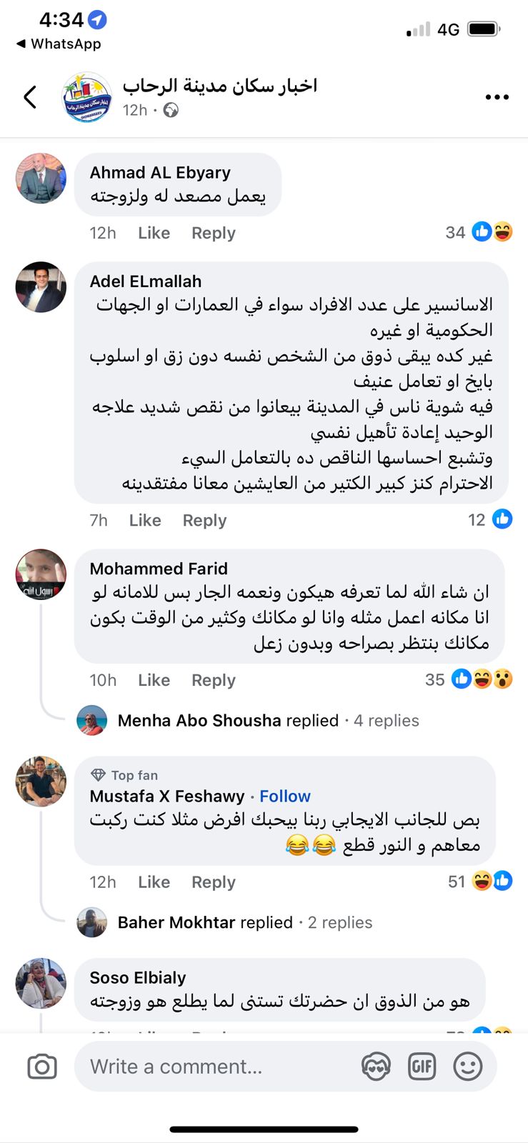 مما دفع السُكان لمشاركة تعليقاته، حيث عقب أحدهم منتقض الشخص الذي منع جاره: يعمل مصعد له ولزوجته، وأخرى: يعني حضرتك مع زوجتك هو هيعملها إيه.. طب التمس أنه تعبان أو مستعجل يلحق يطلع قبل ما النور يقطع، التمس ألف عذر أو أي حاجة مش من حقك تمنعه بإيدك وتقوله لا متطلعش واستنى احنا نطلع.. وحرمة إيه حضرتك معاها هي مش لوحدها أصلًا.. حضرتك بتكابر في الغلط والاعتذار.