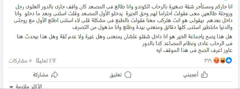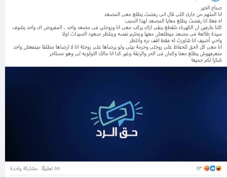 وبدأ أحد السُكان الذي تم منعه من استخدام المصعد من قبل الساكن الآخر، بمشاركة جيرانه على أحد المجموعات على منصة فيسبوك، كاتبًا: أنا جاركم ومستأجر شقة صغيرة.. وانا طالع في المصعد كان واقف جاري بالدور العلوي رجل وزوجته طالعين معي فـ قلت احترامًا لهم وحق الجيرة يدخلو الأول المصعد وأنا استنى.