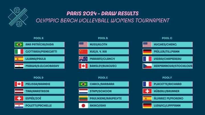 وتشهد منافسات الكرة الطائرة الشاطئية في أولمبياد 2024، مشاركة 24 منتخبا تم تقسيمهم إلى 6 مجموعات.