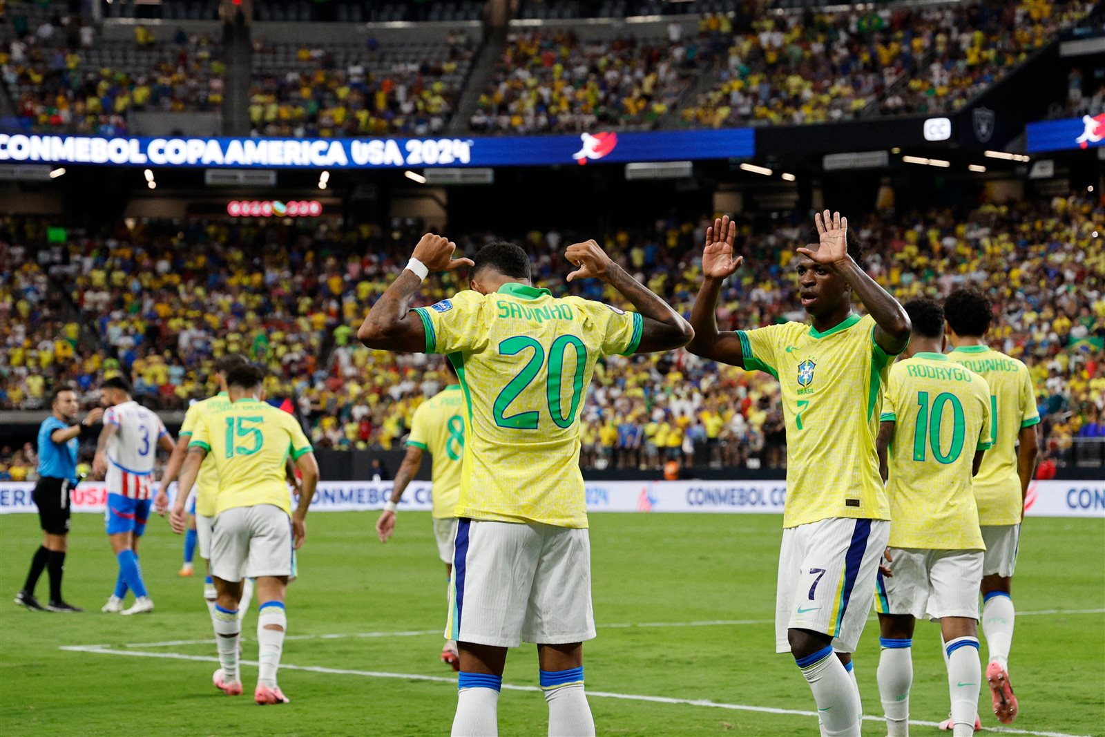 وفي الدقيقة الأخيرة من الوقت بدل الضائع سجل فينيسيوس جونيور الهدف الثالث لصالح منتخب البرازيل.