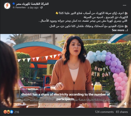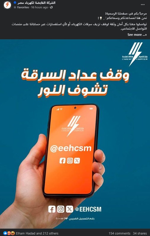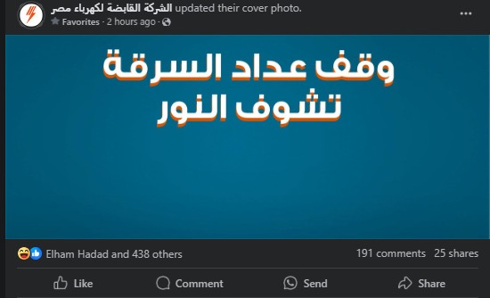 ونشرت الشركة القابضة لكهرباء مصر، منشورات وفيديوهات عبر صفحاتها الرسمية على مواقع التواصل الاجتماعي منذ أيام، لتوضح العلاقة بين سرقة التيار الكهربائي وقطع الكهرباء، مشيرة إلى أن كل منطقة لديها حصة من الكهرباء، وفقا لعدد سكانها الموجودين بها، وعند سرقة التيار الكهربائي، يؤدي إلى زيادة الأحمال على الكهرباء، مما يؤدي في النهاية إلى قطع الكهرباء وتخفيف الأحمال.
