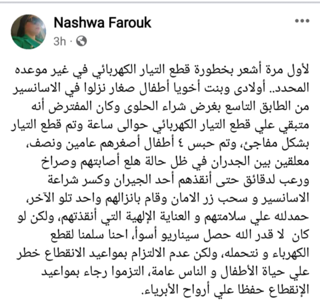 وذكرت نشوى فاروق، مقيمة بالإسكندرية، في منشور لها عبر حسابها على فيسبوك، إن 3 من أبنائها وابنة أختها، كانوا في طريقهم لشراء الحلوى من محل في الطابق الأرضي عندما انقطع التيار الكهربائي، ما أدى إلى توقف المصعد عن الحركة، وساد الذعر بين الأطفال الذين بدأوا بالصراخ والبكاء، بينما حاولت دون جدوى فتح باب المصعد.