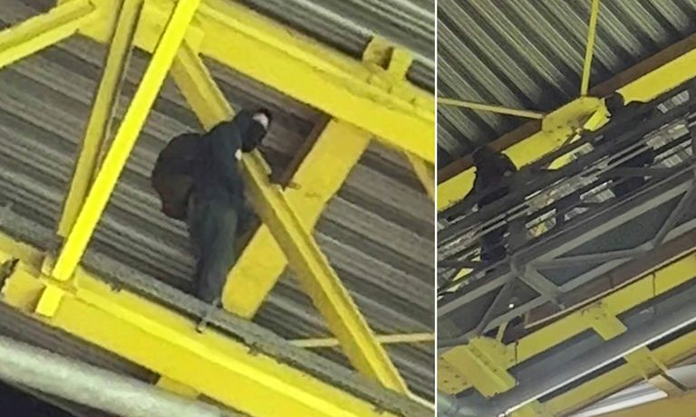 شخص ملثم يتسلق سقف ملعب مباراة ألمانيا والدنمارك
