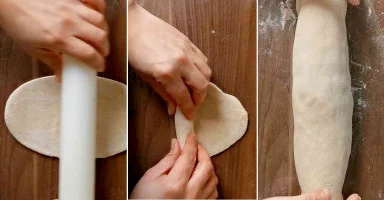 - نضع العجينة على سطح مرشوش بالدقيق ونشكلها على شكل أسطوانة.