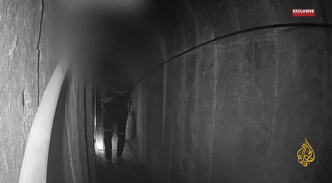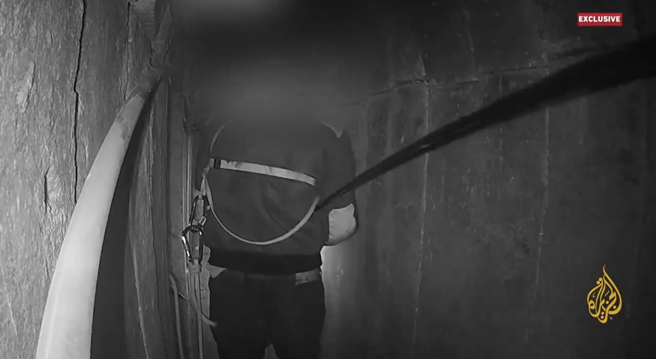 وفي الصورة يظهر إجبار جنود الاحتلال أسيرين على البحث عن متفجرات وأنفاق، بعدما تم تثبيت كاميرات على أجساد الأسرى والتحكم في حركتهم عن بُعد.