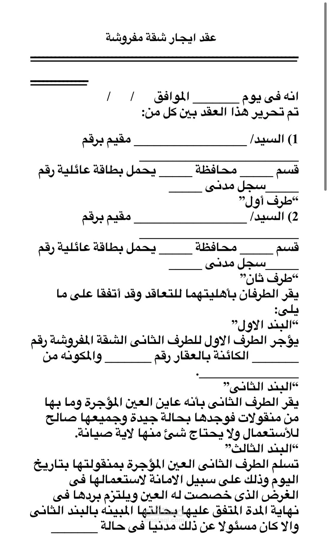 أجر الطرف الأول ( المؤجر ) إلي الطرف الثاني ( المستأجر ) ما هو عبارة عن: ……………، والشقة مشطبة تشطيب كامل دون وجود أية تلفيات من اي نوع.
