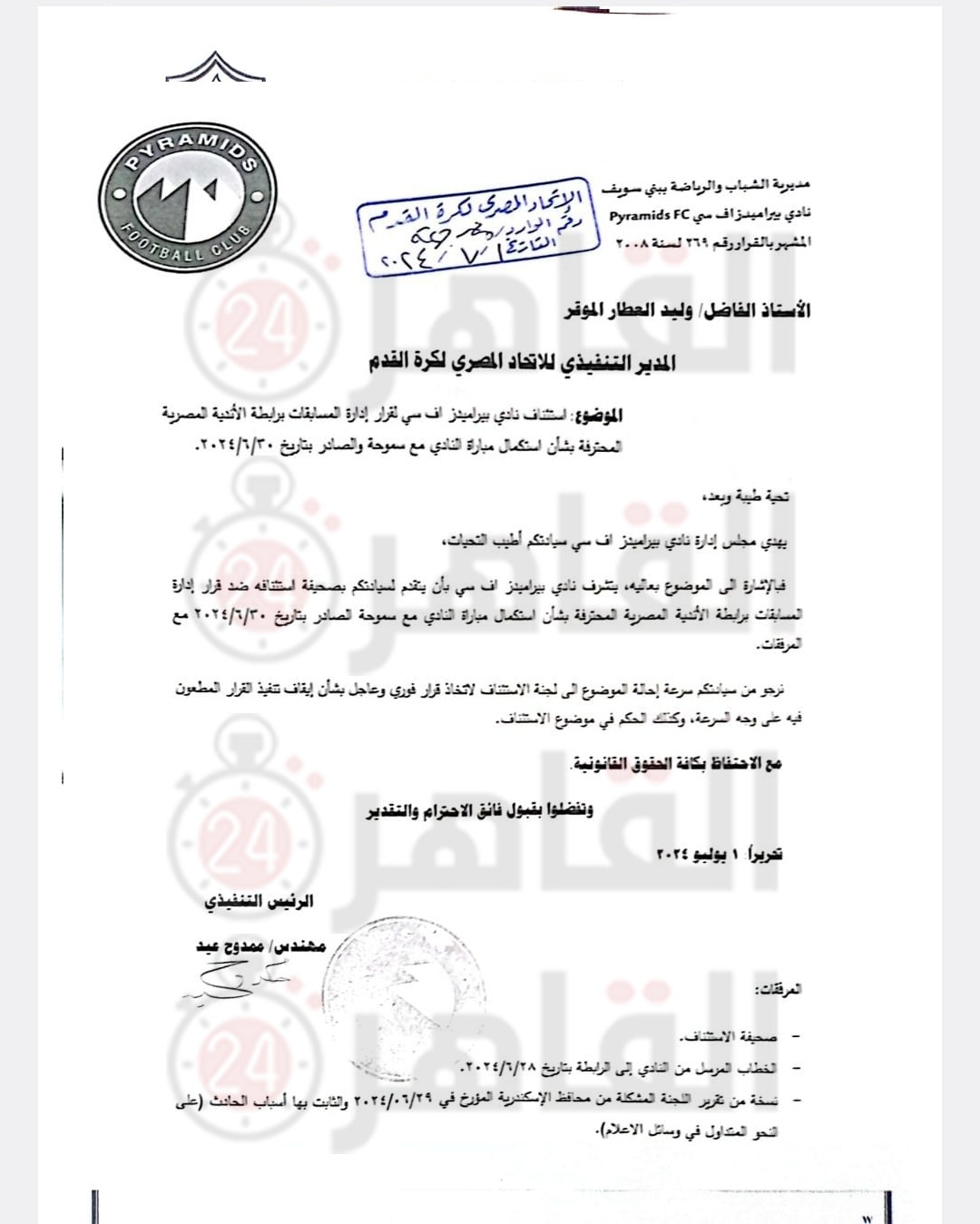 وجاء خطاب نادي بيراميدز كالتالي: الأستاذ الفاضل وليد العطار الموقر المدير التنفيذي للاتحاد المصري لكرة القدم، الموضوع: استئناف نادي بيراميدز اف سي لقرار إدارة المسابقات برابطة الأندية المصرية المحترفة، بشأن استكمال مبارة النادي مع سموحة والصادر بتاريخ 30-6-2024.