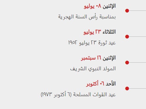 - عيد القوات المسلحة وذكرى حرب أكتوبر: الأحد 6 أكتوبر 2024.