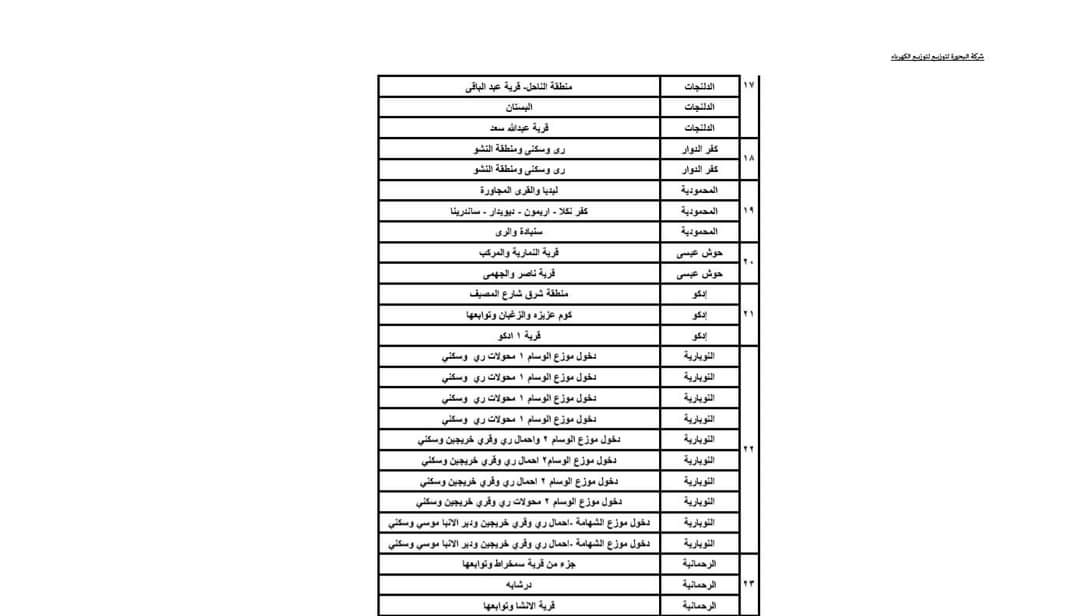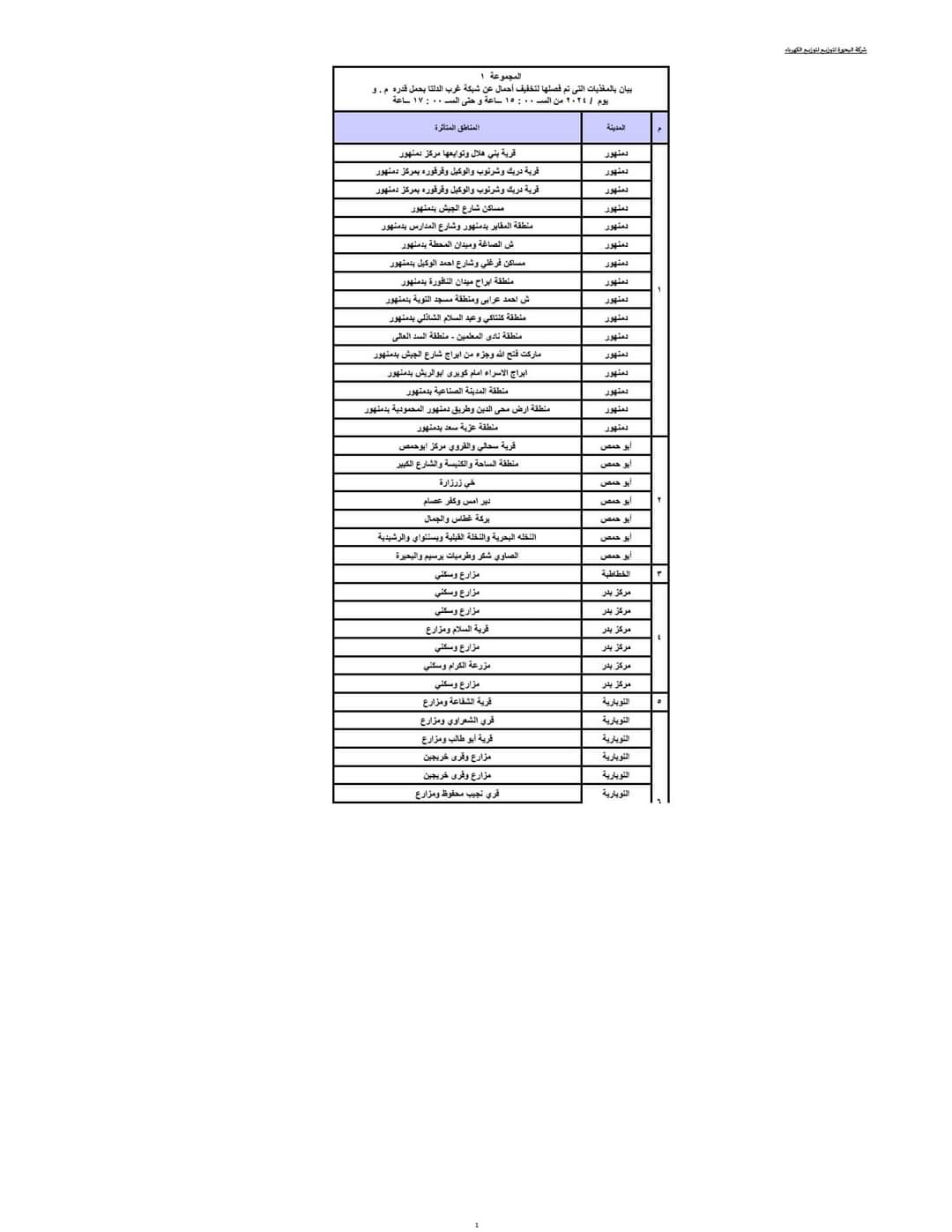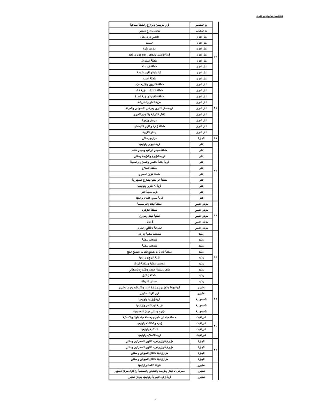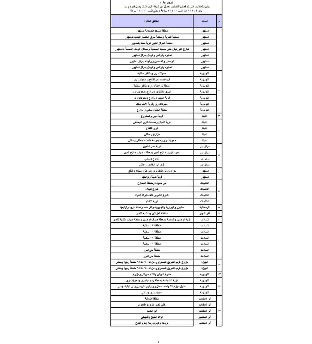 ويبدأ تنفيذ ذلك القرار اعتبارا من اليوم حيث يتم فصل التيار الكهربائي طبقا للمواعيد التالية:- المجموعة الأولى من الساعة 3 حتى الساعة 5 مساء، المجموعة الثانية من الساعة 4 وحتى الساعة 6 مساء، المجموعة الثالثة من الساعة 5 وحتى الساعة 7 مساء، المجموعة الرابعة من الساعة 6 وحتى الساعة 7 مساء، وفقا للجداول المرفقة.
