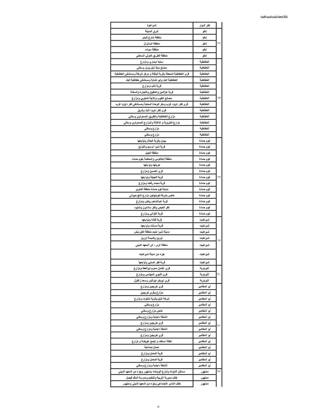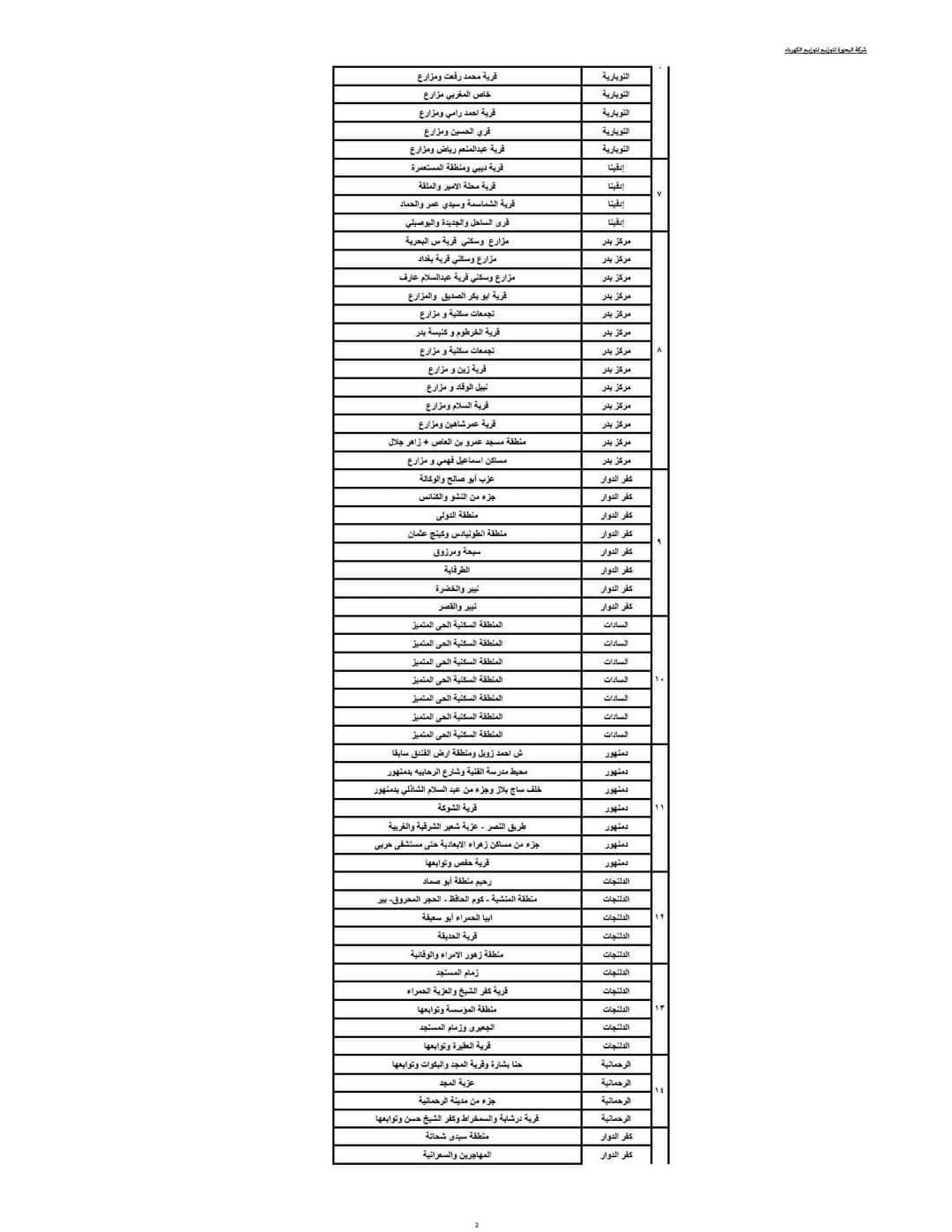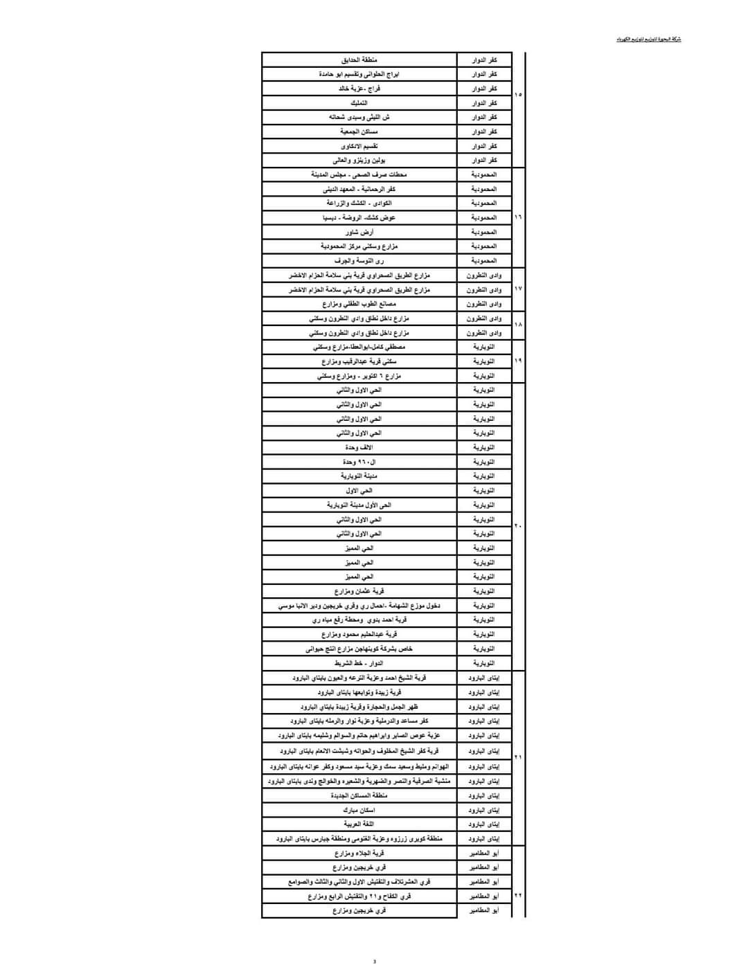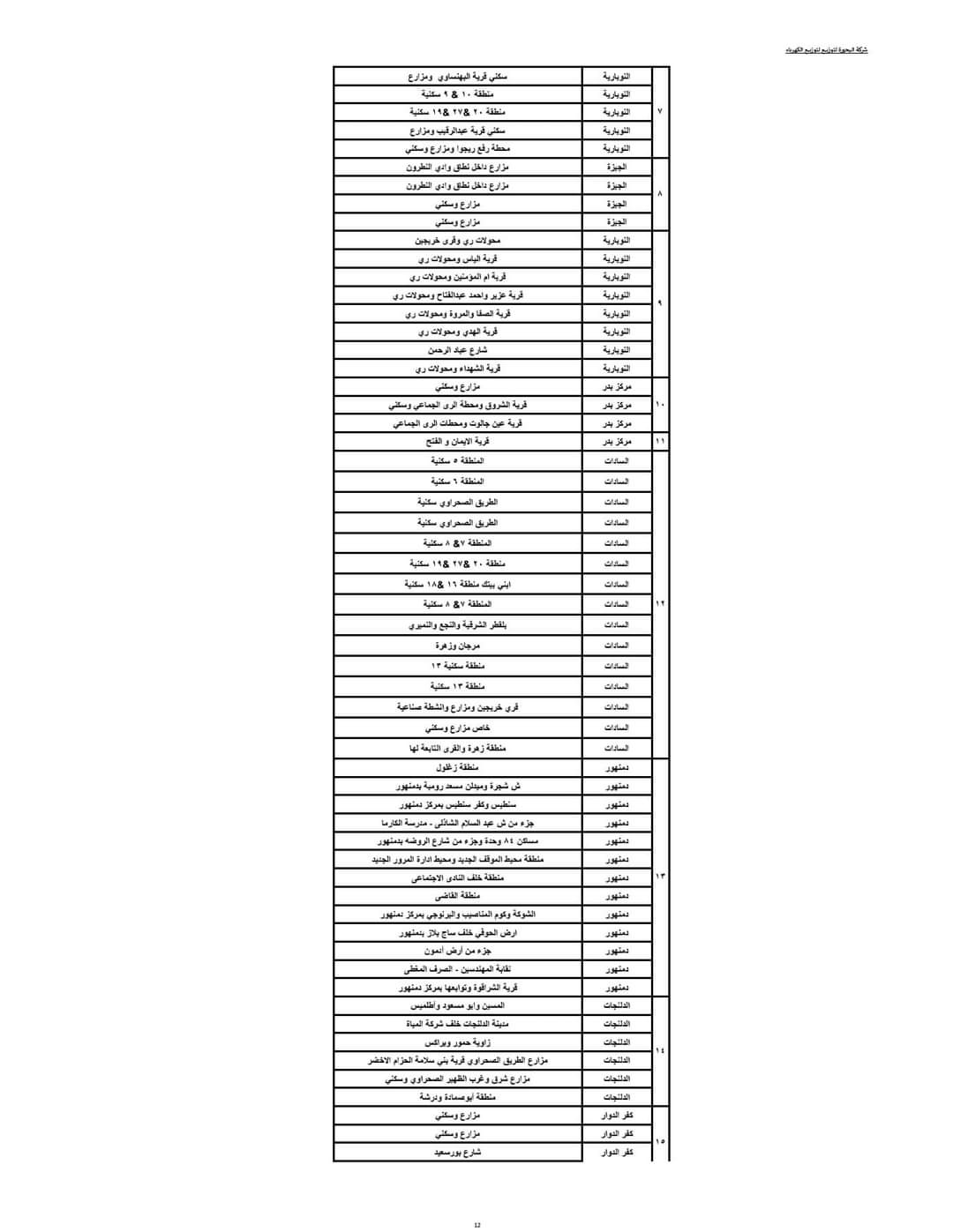 ويبدأ تنفيذ ذلك القرار اعتبارا من اليوم حيث يتم فصل التيار الكهربائي طبقا للمواعيد التالية:- المجموعة الأولى من الساعة 3 حتى الساعة 5 مساء، المجموعة الثانية من الساعة 4 وحتى الساعة 6 مساء، المجموعة الثالثة من الساعة 5 وحتى الساعة 7 مساء، المجموعة الرابعة من الساعة 6 وحتى الساعة 7 مساء، وفقا للجداول المرفقة.