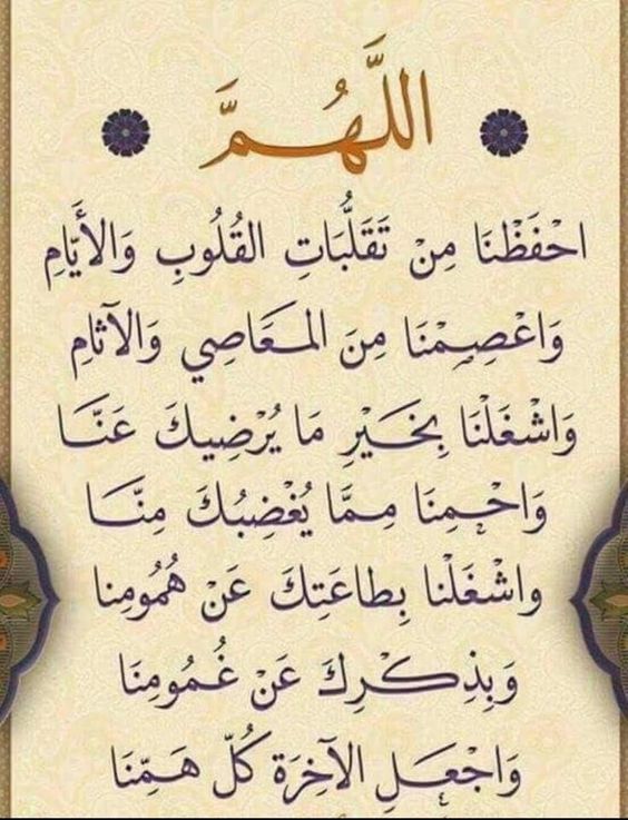 - اللهم أمنا مكر الماكرين وظلم الظالمين واحفظنا من عيون الحاسدين، اللهم ثبتنا على ما يرضيك وقربنا ممن يواليك.