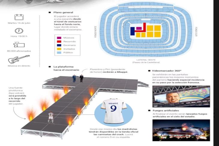 ووفقًا للخطة التي وضعها النادي لاستقبال النجم الفرنسي، فإن مبابي سيدخل إلى الملعب من ممر شرفي، على أن يكون في استقباله فلورنتينو بيريز رئيس النادي الحالي والرئيس الفخري بيري.