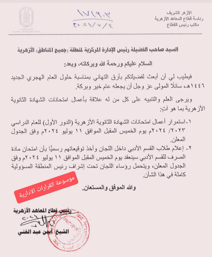 ويرجى العلم والتنبيه على كل من له علاقة بأعمال امتحانات الشهادة الثانوية الأزهرية بما هو آت: