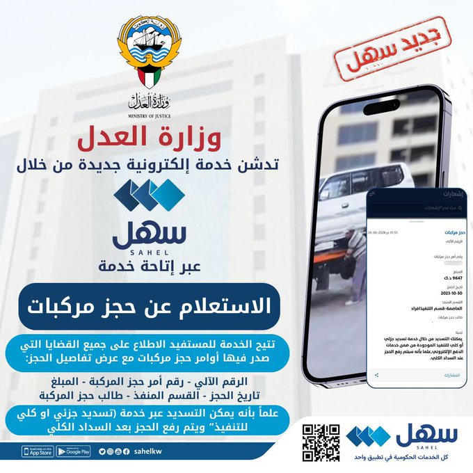 وأفاد وزير العدل والأوقاف والشؤون الإسلامية، في بيان صحفي صادر اليوم، أن خدمة الاستعلام عن حجز المركبات عبر تطبيق سهل، سوف تتيح للمستفيد إمكانية الاطلاع على جميع القضايا التي يصدر فيها أمر حجز مركبة، مشيرا إلى أن هذا التطبيق الموحد للخدمات الإلكترونية الحكومية في دولة الكويت.
