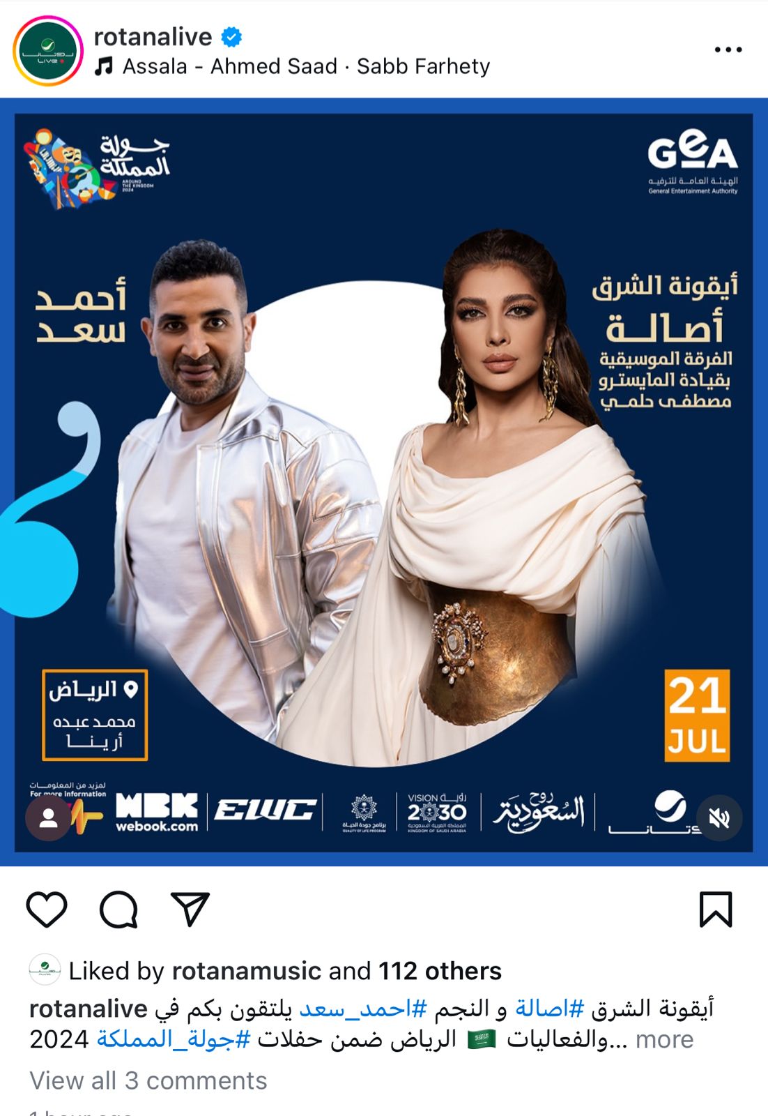 يستعد كل من الفنان أحمد سعد والفنانة أصالة، لإحياء حفل جديد ضمن حفلات جولة المملكة 2024، والمقرر أن تقام يوم 21 يوليو على مسرح محمد عبده أرينا في الرياض.