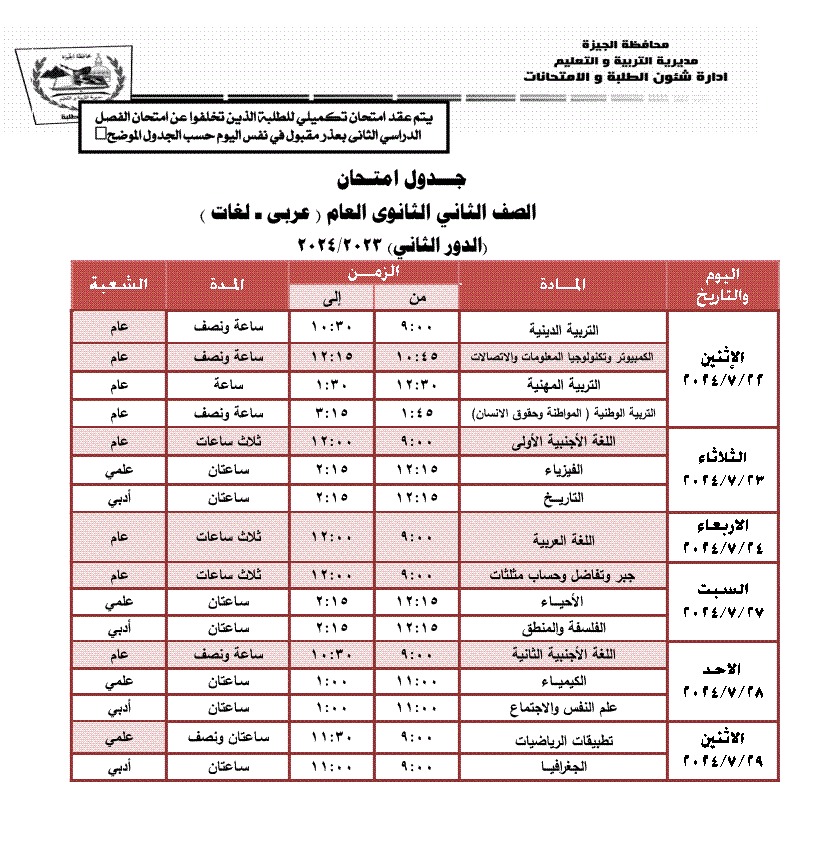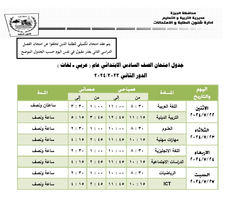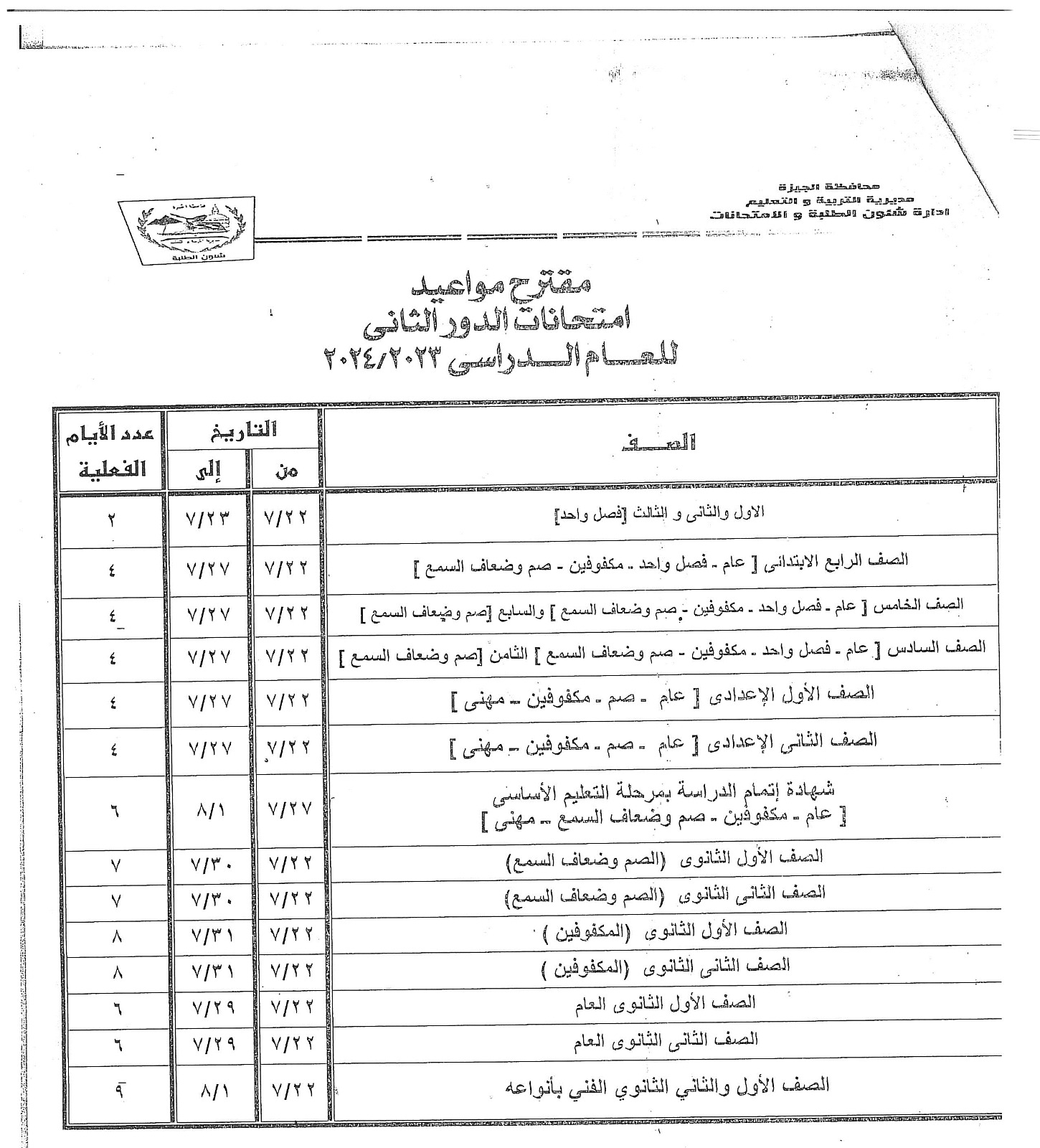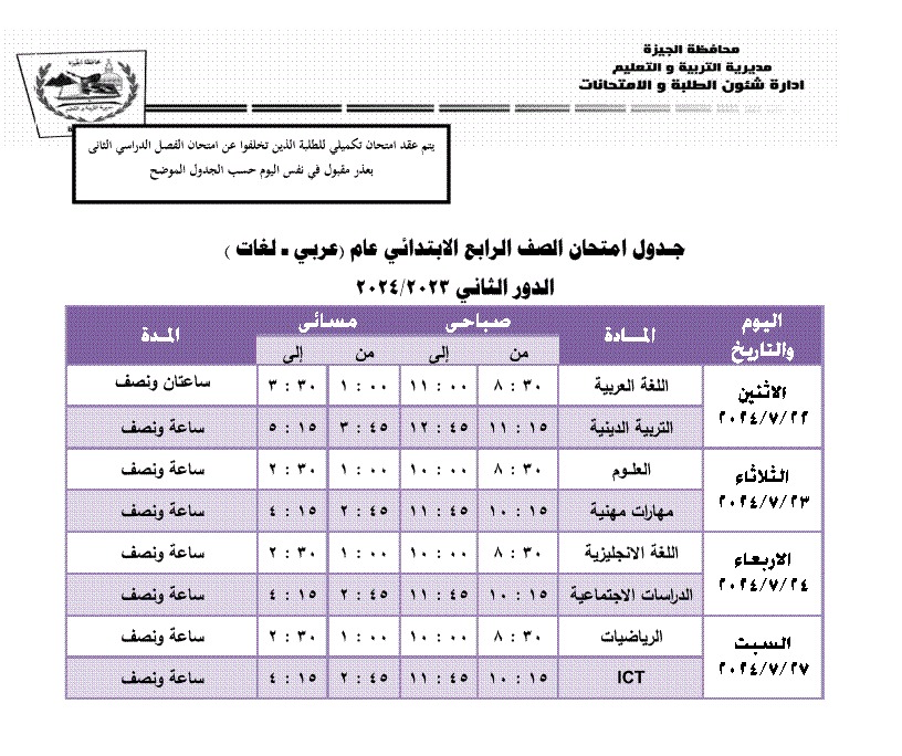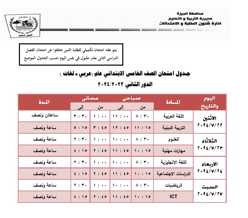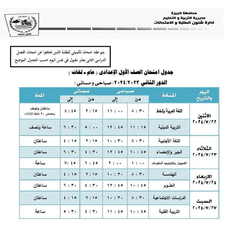 جداول امتحانات الدور الثاني لصفوف النقل الابتدائية والإعدادية والثانوية العام والفني