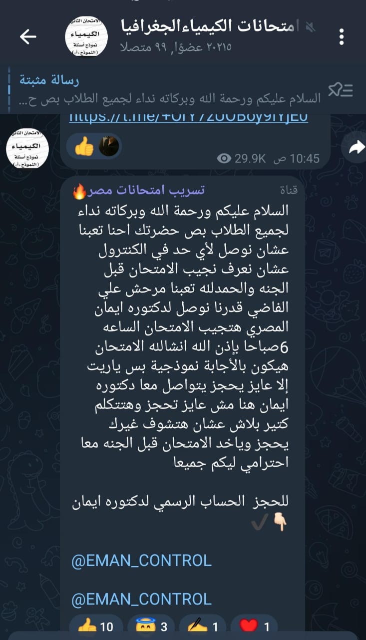 وكتب أدمن جروب شاومينج عبر تطبيق التليجرام: بإذن الله الامتحان هيجي منه دول شوية وهنزل الباقي كيمياء وجغرافيا، احنا تعبنا عشان نوصل لأي حد في الكنترول عشان نعرف نجيب الامتحان قبل اللجنة.