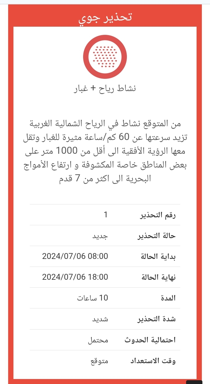 وأطلقت إدارة الأرصاد تحذير أحمر من طقس الكويت اليوم، إذ من المتوقع أن تنشط الرياح الشمالية الغربية وتزيد سرعتها عن 60 كم/ساعة مثيرة للغبار وتقل معها الرؤية الأفقية الى أقل من 1000 متر على بعض المناطق خاصة المكشوفة وارتفاع الأمواج البحرية إلى أكثر من 7 قدم.