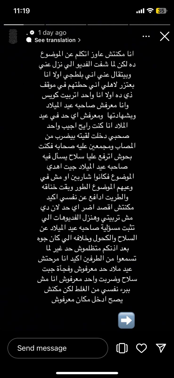 وقال سيف العشماوي، عيد الميلاد كان فيه أسلحة وكحوليات، كانوا شاربين ومش في وعيهم، والموضوع اتطور وبقي خناقة واضطريت أدافع عن نفسي، وأكيد مكنش قصدي أني أضر أي حد، عشان دي مش تربيتي وهنزل الفيديوهات اللي تثبت مسئولية صاحبة عيد الميلاد، عن السلاح والكحول وخلافه.