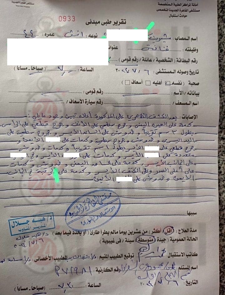 وجاء في التقرير الطبي، أن المطربة شيرين عبد الوهاب مصابة بكدمة في العين اليمنى وجرح سطحي في الأنف وجرح قطعي في الرأس بطول 3 سم، وخدوش بالساعد الأيسر وجروح سطحية.