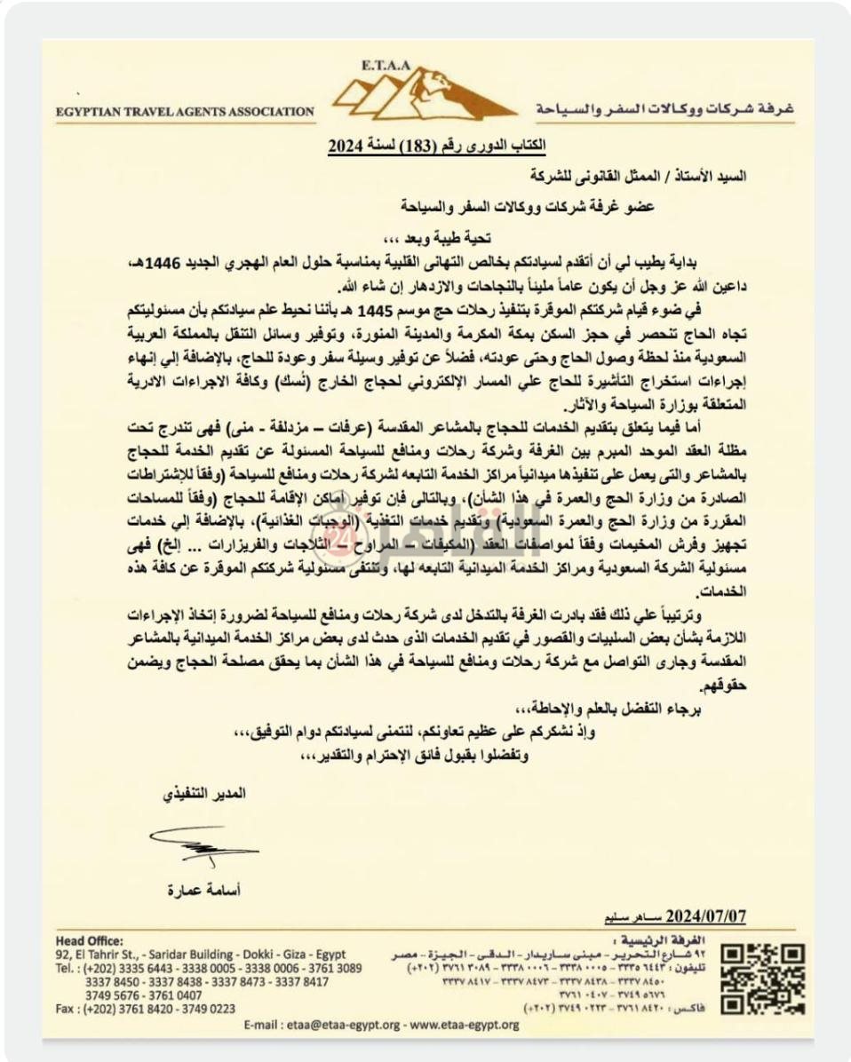 وأوضح نص الخطاب؛ أنه فيما يتعلق بتقديم الخدمات للحجاج بالمشاعر المقدسة عرفات - مزدلفة - منى فهي تندرج تحت مظلة العقد الموحد المبرم بين الغرفة وشركة رحلات ومنافع للسياحة المسئولة عن تقديم الخدمة للحجاج بالمشاعر والتي يعمل على تنفيذها ميدانيًا مراكز الخدمة التابعة لشركة رحلات ومنافع للسياحة وفقًا للاشتراطات الصادرة من وزارة الحج والعمرة في هذا الشأن، وبالتالي فإن توفير أماكن الإقامة للحجاج (وفقًا للمساحات المقررة من وزارة الحج والعمرة السعودية) وتقديم خدمات التغذية الوجبات الغذائية)، بالإضافة إلي خدمات تجهيز وفرش المخيمات وفقًا لمواصفات العقد المكيفات - المراوح - الثلاجات والفريزارات) فهي مسئولية الشركة السعودية ومراكز الخدمة الميدانية التابعة لها، وتنتفى مسئولية شركتكم الموقرة عن كافة هذه الخدمات.