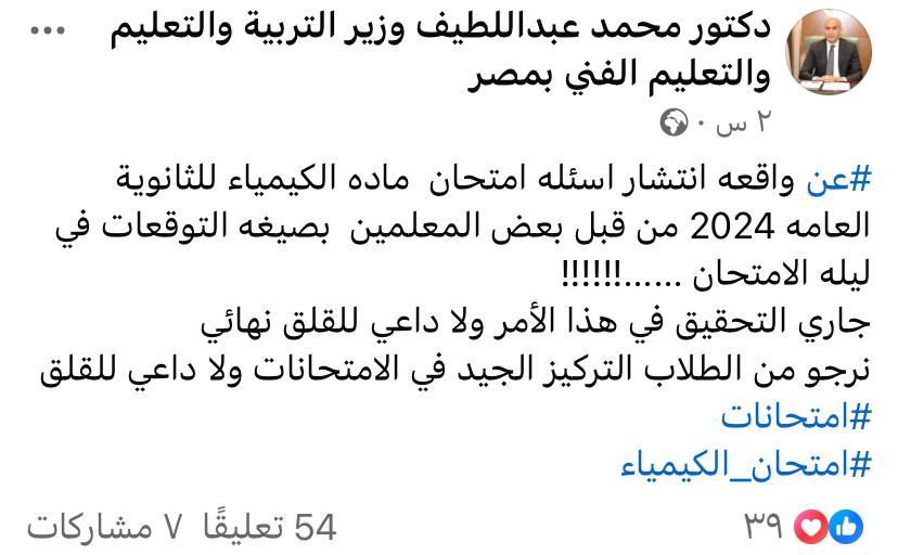 ونشرت الصفحة تصريحات لـ الدكتور محمد عبد اللطيف وزير التربية والتعليم والتعليم الفني، والتي جاءت كالتالي: عن واقعة انتشار أسئلة امتحان مادة الكيمياء للثانوية العامة 2024 من قبل بعض المعلمين بصيغة التوقعات في ليله الامتحان، جارِ التحقيق في هذا الأمر ولا داعي للقلق نهائيا، ونرجو من الطلاب التركيز الجيد في الامتحانات ولا داعي للقلق.