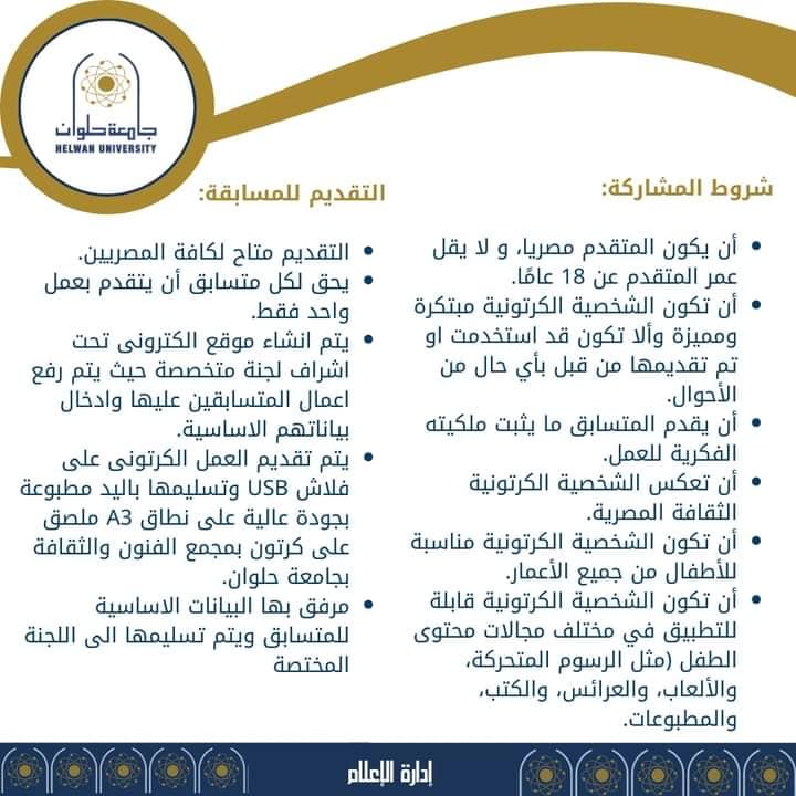 أعلنت جامعة حلوان، عن إطلاق الموسم الثاني من مسابقة تصميم الشخصية الكرتونية مصر الابتكارية لعام 2024، بناءً على قرار المجلس الأعلى للجامعات في جلسته المنعقدة بتاريخ 25/5/2024، وتأتي هذه المبادرة في إطار الجهود المبذولة لتطوير ودعم صناعة محتوى الطفل من خلال الرسوم المتحركة وبرامج الأطفال في مصر.