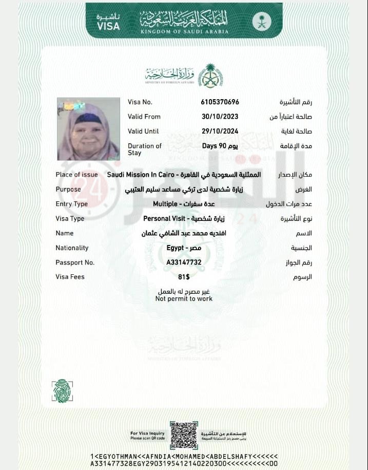 وحصل القاهرة 24 على تأشيرة السفر والتي توضح ذهاب الحاجة أفندية للمملكة العربية السعودية، لقضاء فترة زيارة شخصية وليس لأداء فريضة الحج.