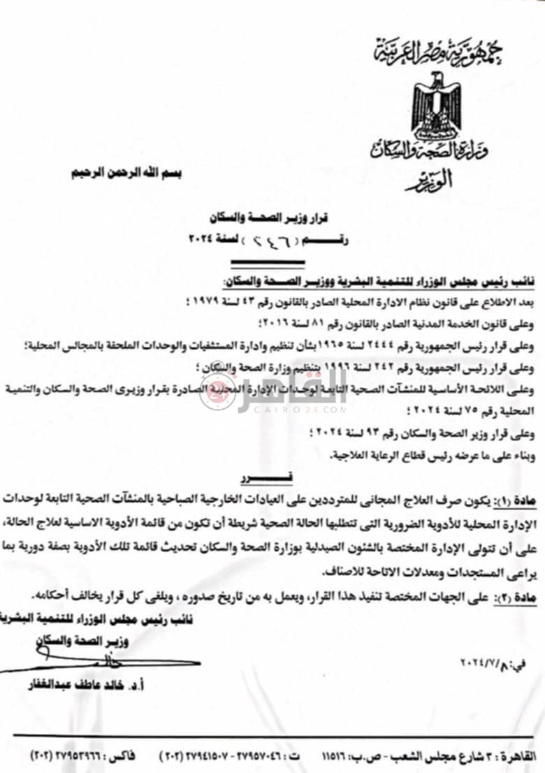 ونص القرار على أن يكون صرف العلاج المجاني للمترددين على العيادات الخارجية الصباحية بالمنشآت الصحية التابعة لوحدات الإدارة المحلية للأدوية الضرورية التي تتطلبها الحالة الصحية شريطة أن تكون من قائمة الأدوية الأساسية لعلاج الحالة على أن تتولى الإدارة المختصة بالشئون الصيدلية بوزارة الصحة والسكان تحديث قائمة تلك الأدوية بصفة دورية بما يراعى المستجدات ومعدلات الإتاحة للأصناف.