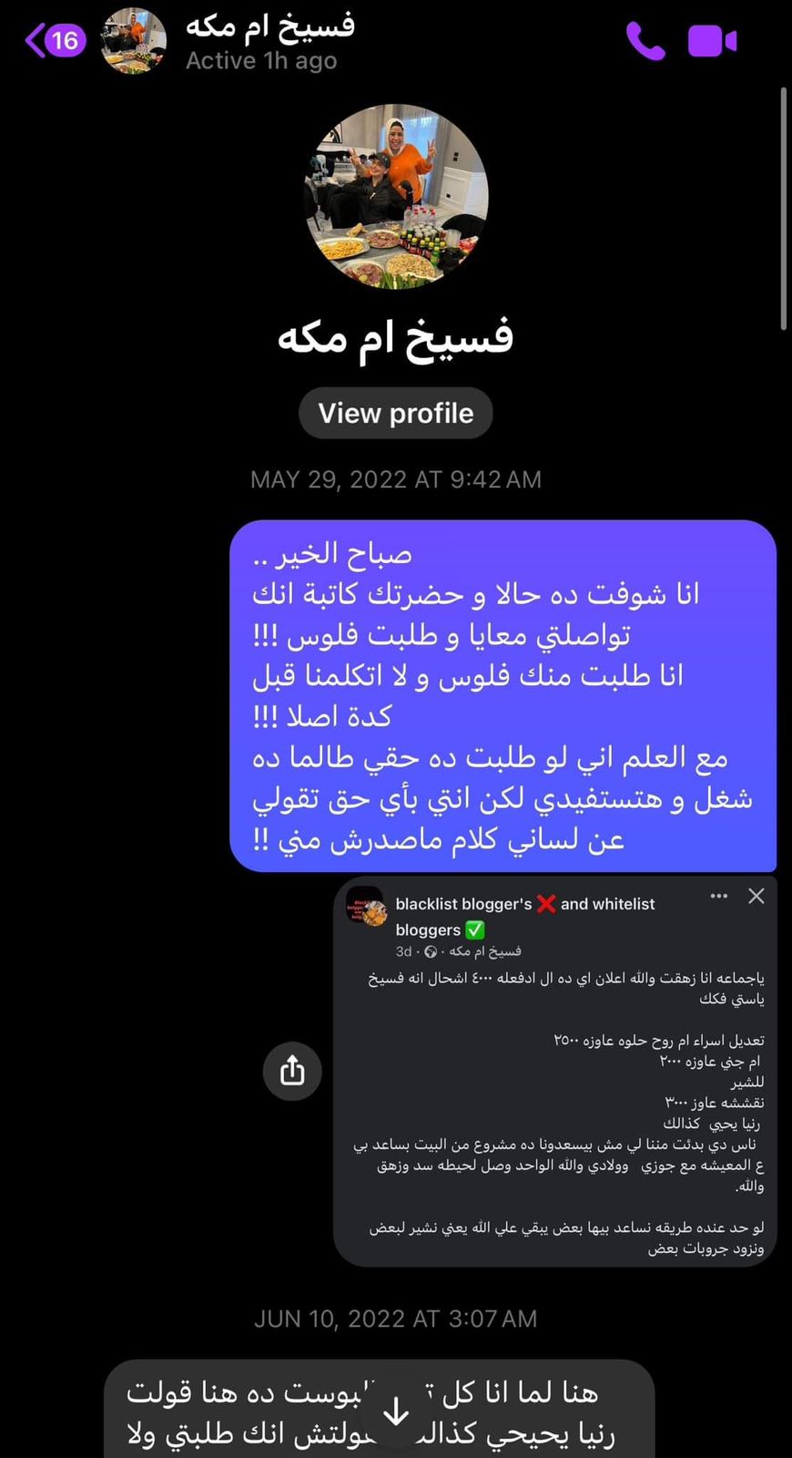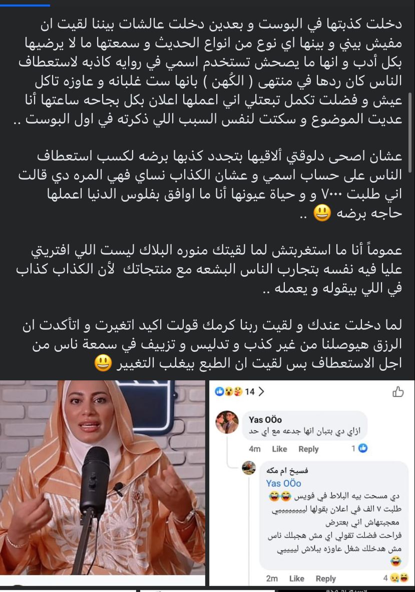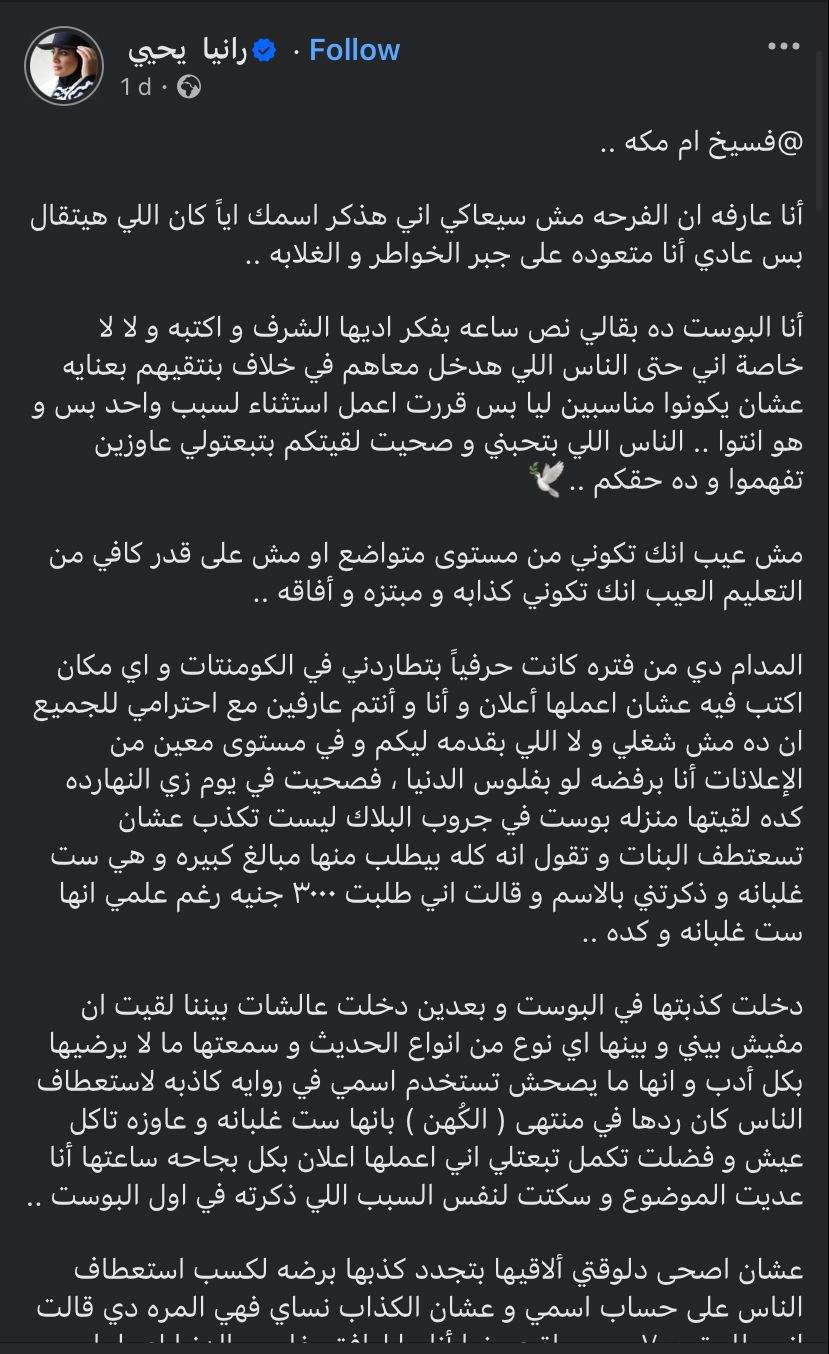 وتابعت رانيا يحيى، مش عيب إنك تكوني من مستوى متواضع أو مش على قدر كافي من التعليم، العيب إنك تكوني كذابة ومبتزة وإفاقة، المدام دي من فترة كانت حرفيًا تطاردني في الكومنتات، وأي مكان أكتب فيه عشان أعملها إعلان، وأنا وأنتم عارفين مع احترامي للجميع إن ده مش شغلي ولا اللي بقدمه ليكم، وفي مستوى معين من الإعلانات أنا برفضه لو بفلوس الدنيا، فصحيت في يوم زي النهاردة كده لقيتها منزله بوست في جروب البلاك ليست تكذب عشان تستعطف البنات وتقول إنه كله بيطلب منها مبالغ كبيرة، وهي ست غلبانة وذكرتني بالاسم وقالت إني طلبت 3000 جنيه، رغم علمي إنها ست غلبانه وكده.