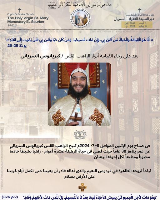 وقال دير العذراء السريان للأقباط الأرثوذكس، في بيان له: في صباح يوم الاثنين الموافق 8- 7- 2024م تنيح الراهب القس كبريانوس السريانى عن عمر يناهز 38 عامًا، حيث قضى فى حياة الرهبنة 10 أعوام - راهبًا نشيطًا خادمًا محبوبًا ومطيعًا لكل إخوته الرهبان، الرب ينيح روحه الطاهرة فى فردوس النعيم والذى أعانه قادر أن يعيننا حتى يكون لنا نصيبًا وميراثًا مع الملائكة والقديسين.