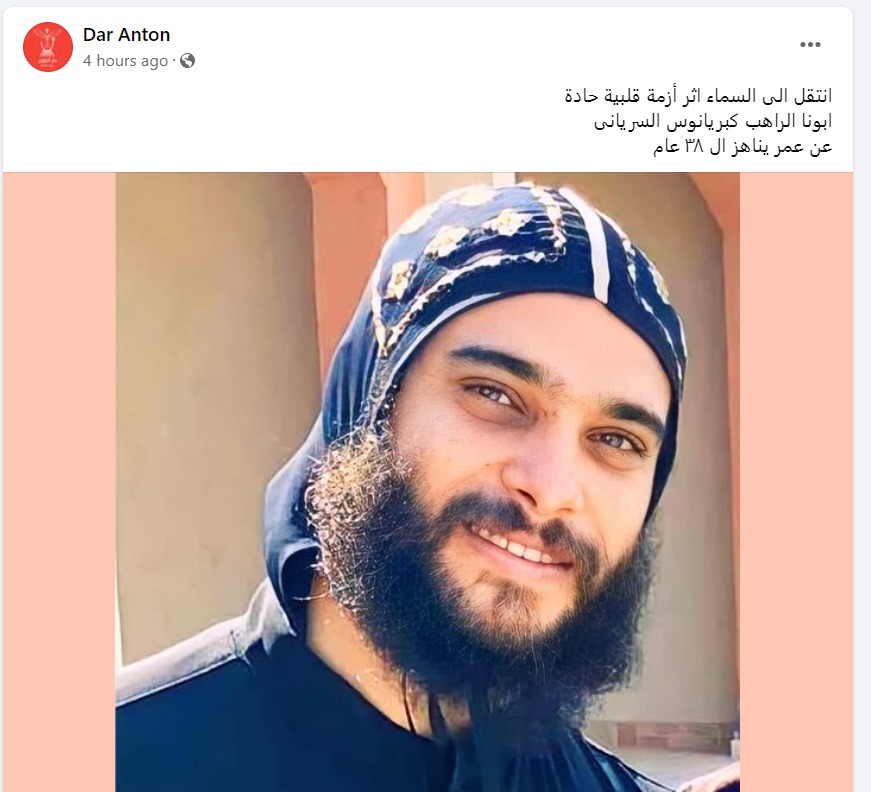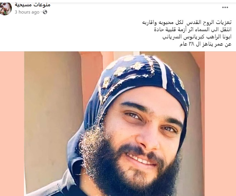 وكشف دير أنتون عبر حسابه على مواقع التواصل الاجتماعي، أن وفاة الراهب القس كبريانوس السرياني، جاءت إثر أزمة قلبية حادة.