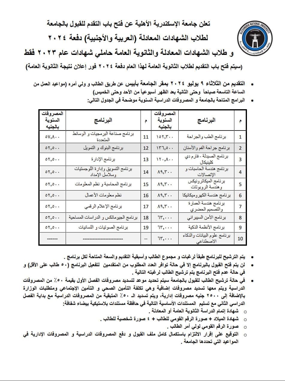 ولفتت جامعة الإسكندرية الأهلية، إلى أنه يتم الترشيح للبرنامج طبقًا لرغبات ومجموع الطالب وأسبقية التقديم والسعة المتاحة لكل برنامج.