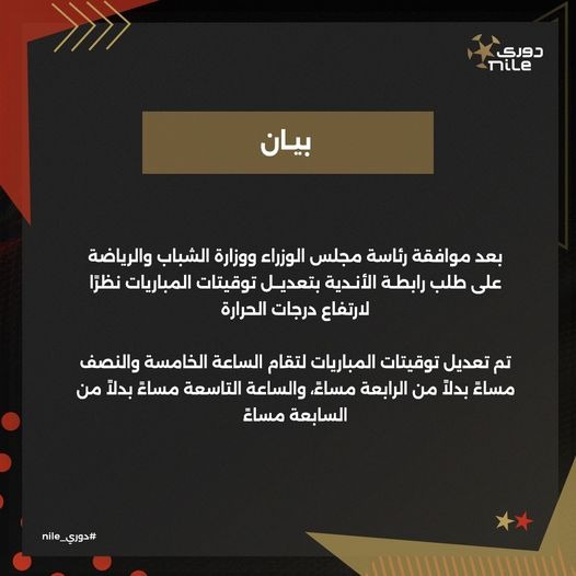 وجاء بيان رابطة الأندية المصرية المحترفة على النحو التالي:- بعد موافقة رئاسة مجلس الوزراء ووزارة الشباب والرياضة على طلب رابطة الأندية بتعديل توقيتات المباريات نظرًا الارتفاع درجات الحرارة.