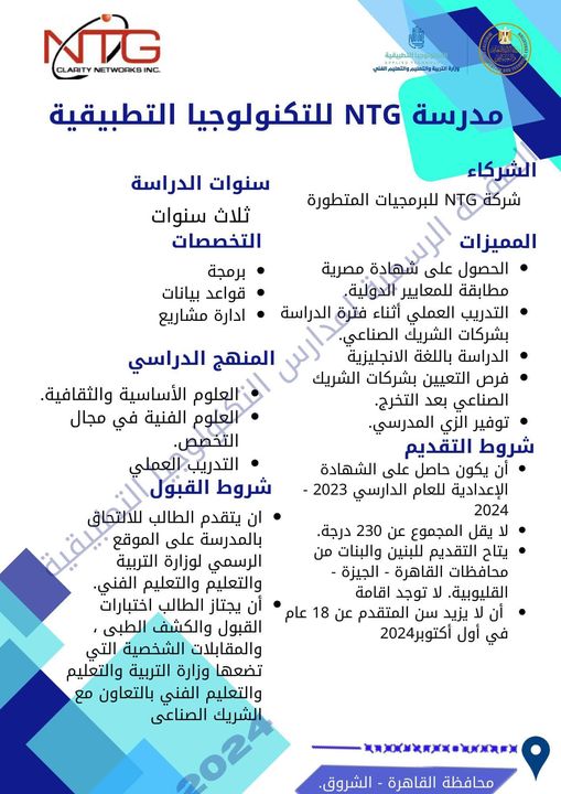 تعد مدرسة مدرسة NTG للتكنولوجيا التطبيقية من أحد الفرص المتاحة لطلاب الشهادة الإعدادية للعام الدراسي الحالي 2023-2024، حيث تقدم الكثير من المميزات أهمها توفير فرص عمل مناسبة، خاصة أن مجال البرمجة والتكنولوجيا الحديثة يحتاج للكثير من العمالة القادرة على الاستثمار والاستفادة منه في جميع المصالح التي تهم أفراد المجتمع المصري.
