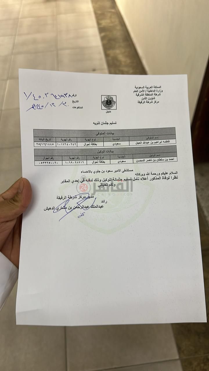 وعقب إبلاغه بالوفاة طالب بالحصول على تقرير طبي لمعرفة سبب الوفاة، كما انه فوجئ برفض الطبيب المسؤول عن العملية لقائه، واستكفى بإرسال محاميه الذي يدعى “أ.ش” بمنطقة الدقي، والذي بدوره طلب الحصول على أموال العمليتين (30 ألف ريال سعودي)، والتوجه إلى الوحدة الصحية بالتجمع الخامس لإستخراج شهادة وفاة.