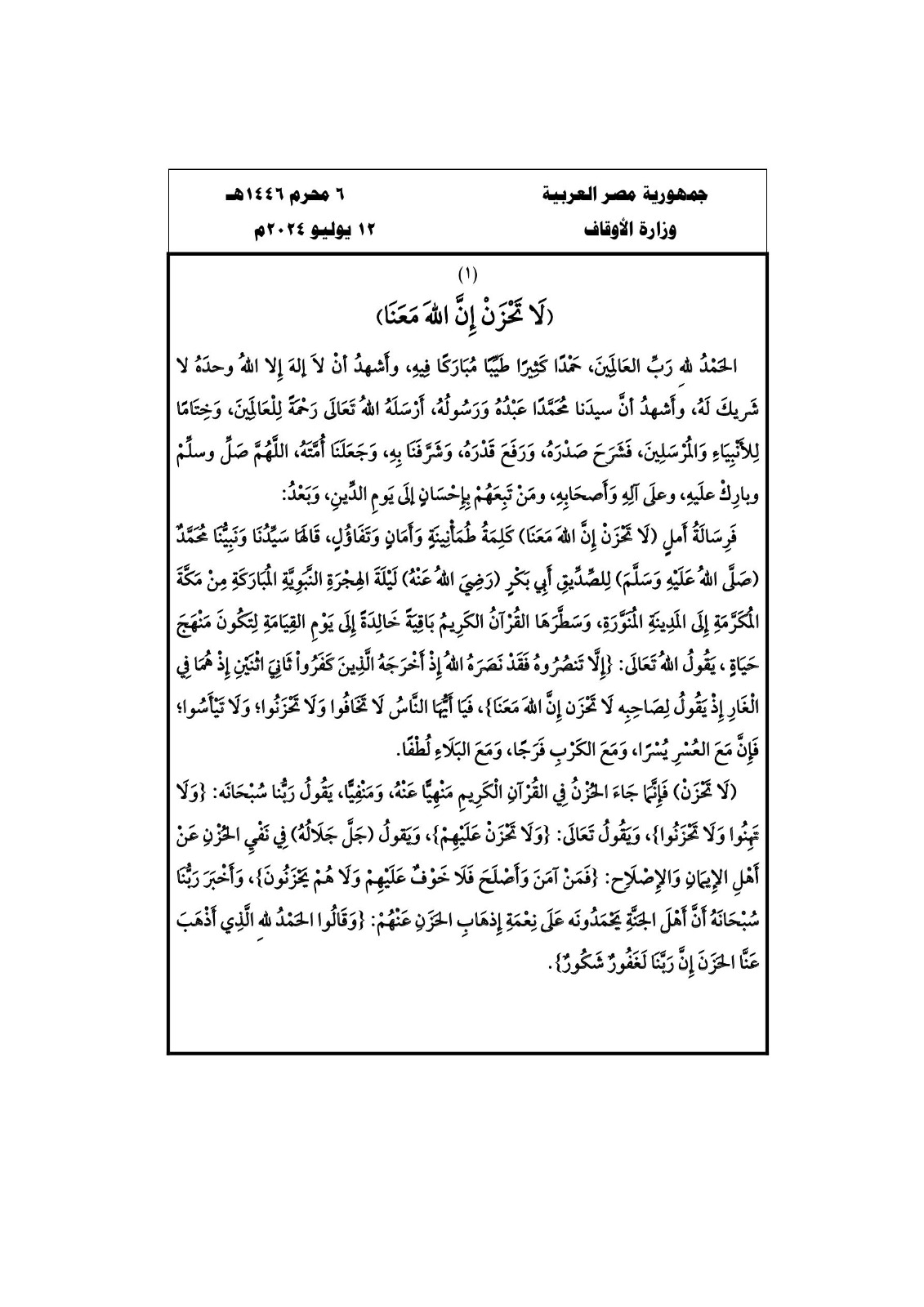 أعلنت وزارة الأوقاف أن خطبة الجمعة المقبلة ستتناول موضوعًا بعنوان "لا تحزن إن الله معنا"، والتي تهدف إلى بث روح الطمأنينة والتفاؤل بين المصلين من خلال استشعار معية الله تعالى وأثرها في تحقيق السكينة والطمأنينة.