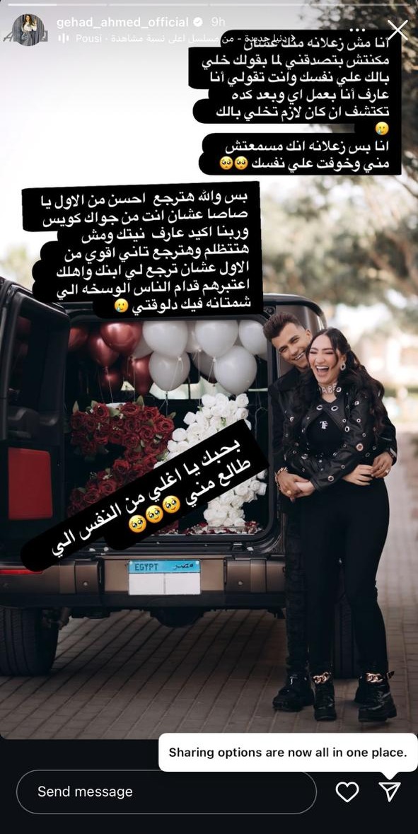 ونشرت زوجة المطرب عصام صاصا، صورة عبر حسابه الشخصي بموقع تبادل الصور والفيديوهات إنستجرام، أرفقتها بتعليق: أنا مش زعلانة منك عشان مكنتش بتصدقني لما بقولك أنا عارف أنا بعمل أيه وبعد كده تكتشف أن كان لازم تخلي بالك، أنا بس زعلانة أنك مسمعتش مني وخوفت على نفسك.