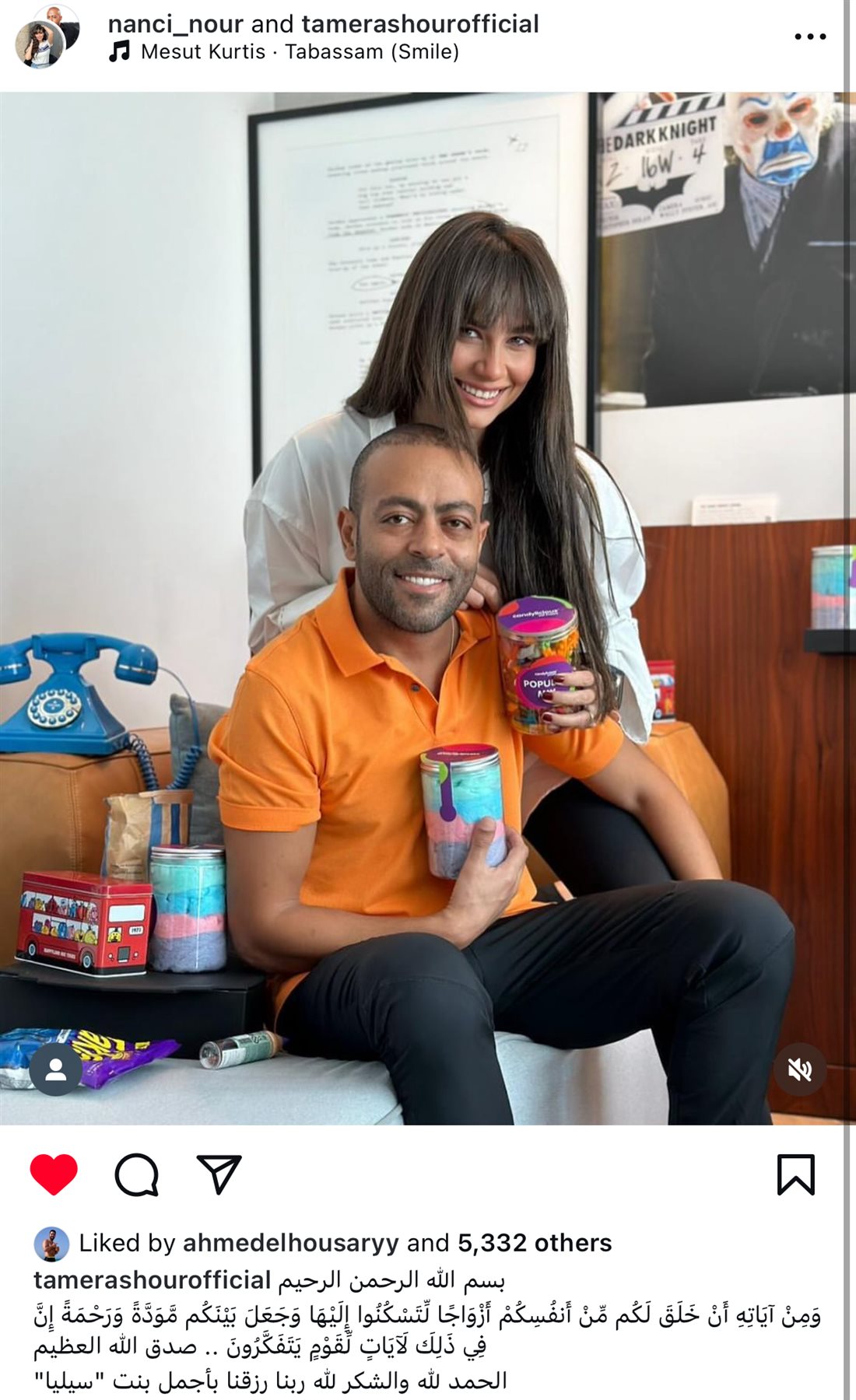 وبآية قرآنية، عبرت نانسي نور عن سعادتها بهذه اللحظة، إذ كتبت على الصورة التي تجمعها بتامر عاشور: بسم الله الرحمن الرحيم، “وَمِنْ آيَاتِهِ أَنْ خَلَقَ لَكُم مِّنْ أَنفُسِكُمْ أَزْوَاجًا لِّتَسْكُنُوا إِلَيْهَا وَجَعَلَ بَيْنَكُم مَّوَدَّةً وَرَحْمَةً إِنَّ فِي ذَلِكَ لَآيَاتٍ لِّقَوْمٍ يَتَفَكَّرُونَ”.. صدق الله العظيم، الحمد لله والشكر لله ربنا رزقنا بأجمل بنت "سيليا"