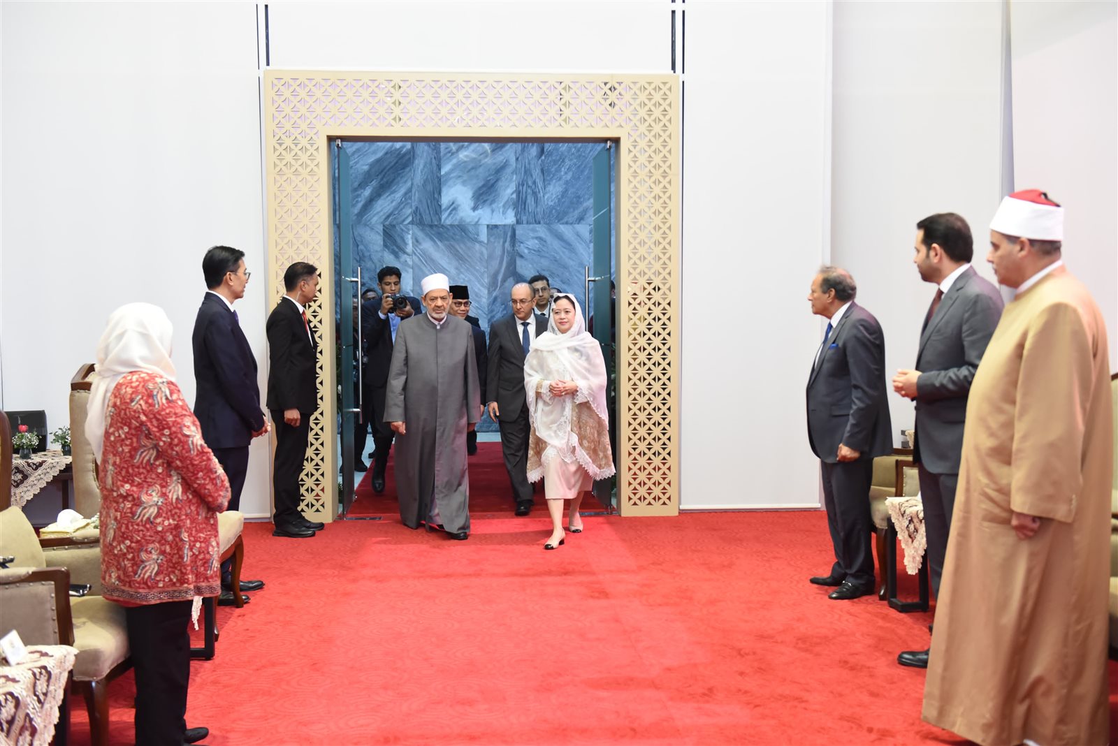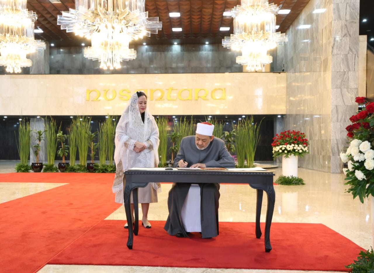 استقبلت بوان ماهاراني، رئيسة مجلس النواب الإندونيسي، فضيلة الإمام الأكبر أ.د أحمد الطيب، شيخ الأزهر الشريف، رئيس مجلس حكماء المسلمين، في المبنى التاريخي لمجلس النواب الإندونيسي، الذي تم إنشاؤه من قبل السيد الرئيس أحمد سوكارنو، أول رئيس لإندونيسيا عام 1965.