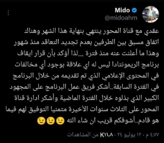 وكتب أحمد حسام ميدو عبر حسابه على منصة X، عقدي مع قناة المحور ينتهي بنهاية هذا الشهر وهناك اتفاق مسبق بين الطرفين بعدم تجديد التعاقد منذ أشهر، وهذا ما أعلنت عنه منذ فترة.